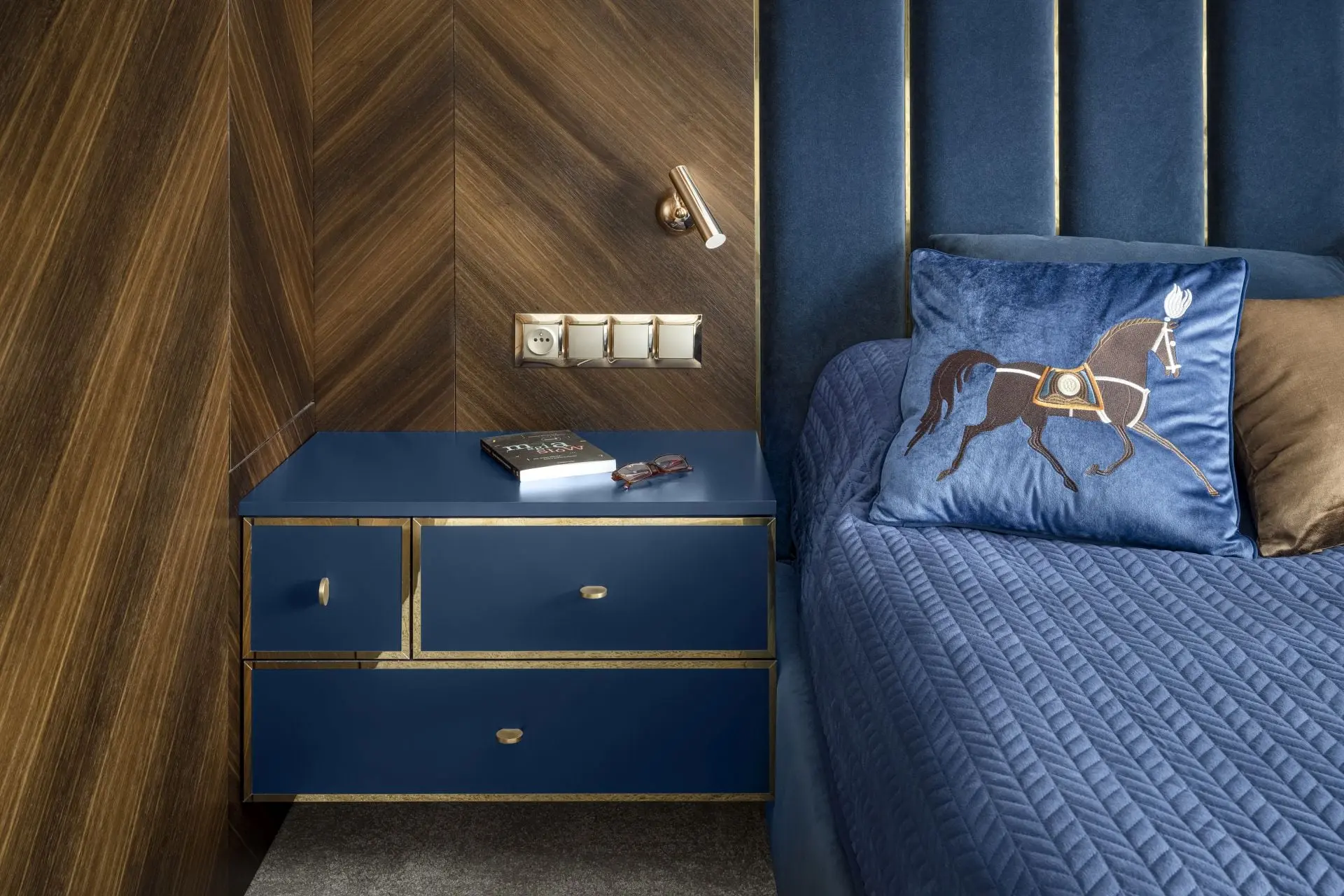 W sypialni kolorem przewodnim jest nasycony granat przywodzący na myśl skojarzenie z nocnym niebem. Barwę tę przyjęło wykonane na zamówienie ozdobne wezgłowie łóżka, a także szafki nocne i okrągła aksamitna pufa. Lustro, po lewej stronie, kryje obszerną garderobianą szafę, w której odbija się zjawiskowy żyrandol. Podobnie jak w przypadku strefy dziennej, tu również dopełnieniem są złote akcenty: wiszące lampy.