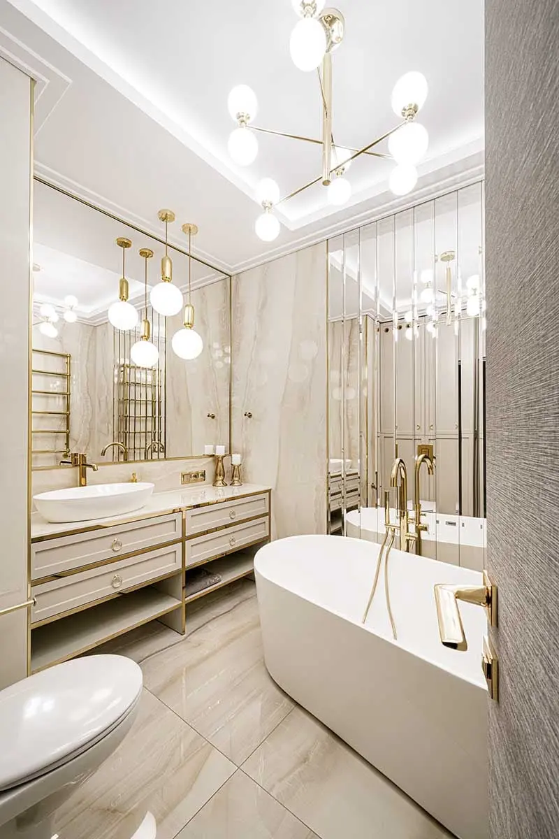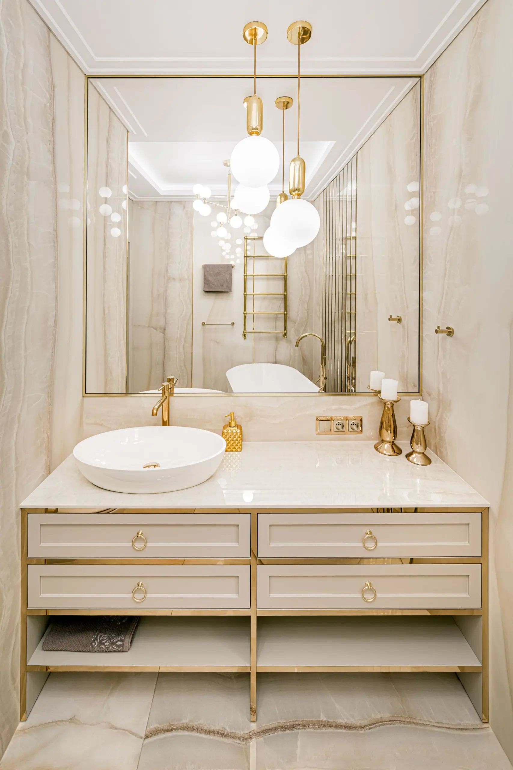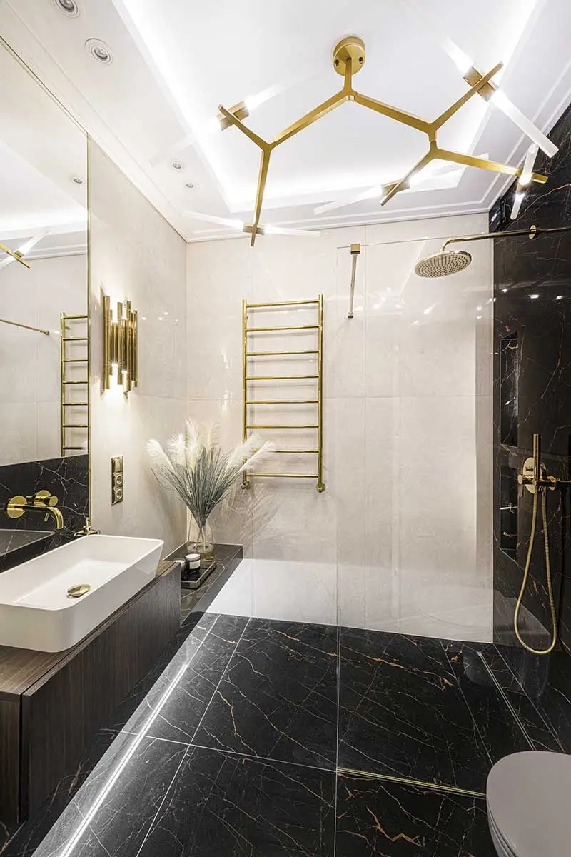Łazienka jest kontynuacją całości. Ściany i podłogę pokrywają wielkoformatowe gresowe płyty w kolorach ciepłej bieli i beżu z przeżyleniami. Również tutaj, podobnie jak w całym apartamencie, wzrok przykuwają złote detale w postaci baterii, lamp i drabinki przy prysznicu.