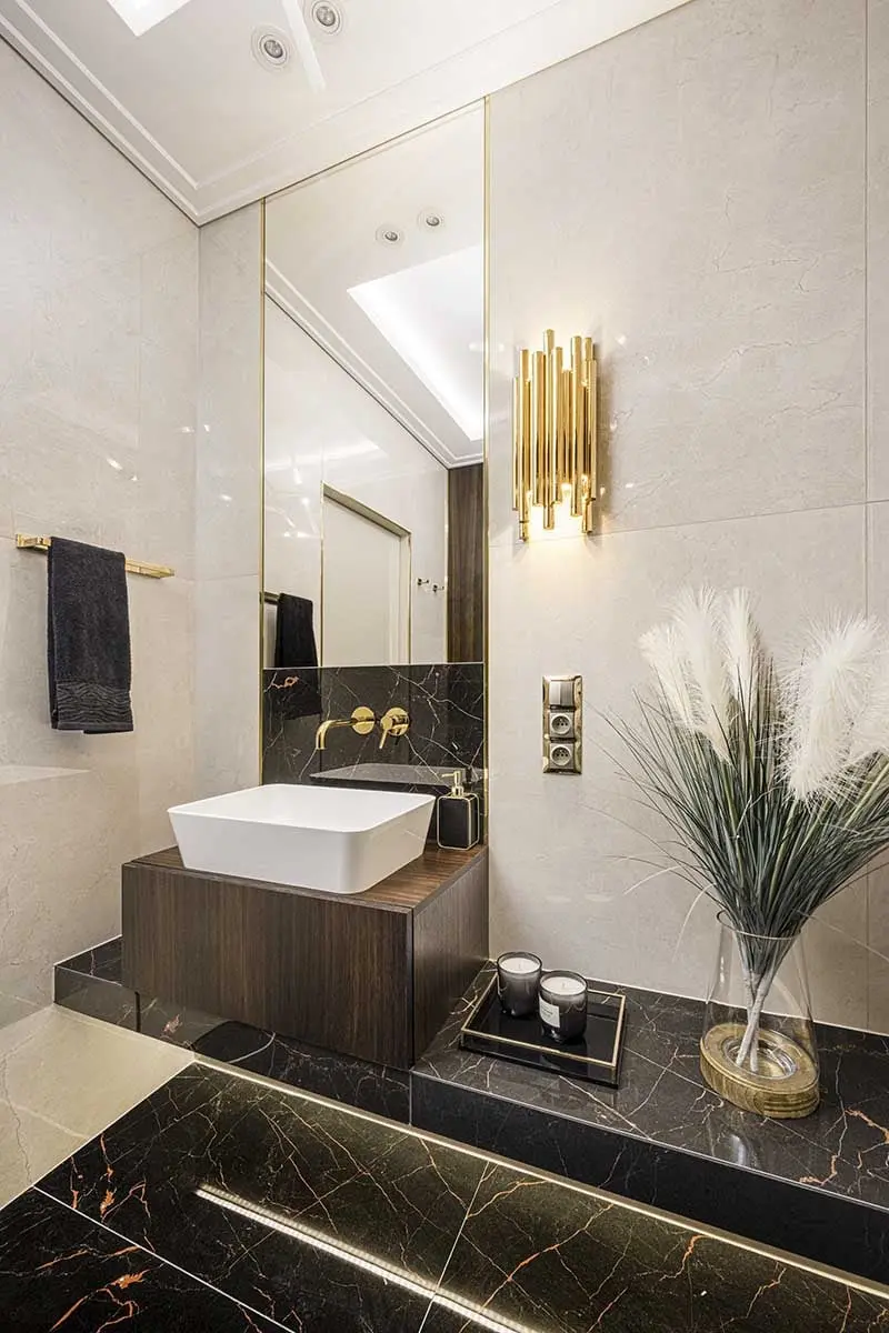 Pani domu bardzo aktywnie uczestniczyła w procesie projektowym – śledzi trendy, a zakupy online to jej pasja, dlatego samodzielnie wybrała oświetlenie i dekoracyjne akcesoria, które świetnie dopełniły charakter aranżacji. Właścicielom zależało na tym, by mieszkanie było pełne elegancji, ale jednocześnie ciepłe i przytulne. Stąd decyzja o zastosowaniu barw ziemi i naturalnego drewna. W roli głównej występuje tu jednak złoto, które pojawia się na wykonanym na zamówienie stole, grzejnikach czy bateriach łazienkowych. Znaczna część wyposażenia powstała specjalnie na potrzeby realizacji przy współpracy zaprzyjaźnionych z właścicielką wykonawców. Dzięki temu apartament nie tylko oddaje osobowość mieszkańców, ale także ich zamiłowanie do pięknych przedmiotów.
