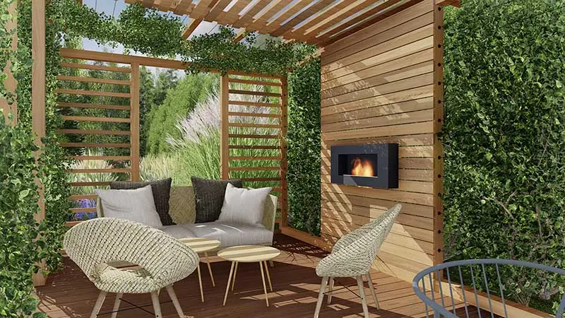 W drugiej części znalazło się miejsce na wygodną sofę z fotelami. Na ścianie obitej drewnianymi panelami zawiśnie biokominek o nowoczesnej formie. W projekcie zastosowano drewno, wiklinę i rattan w formie nowoczesnych i wygodnych mebli. Nawierzchnia to głównie drewniane deski w ciepłych jasnych odcieniach brązu oraz żwir.