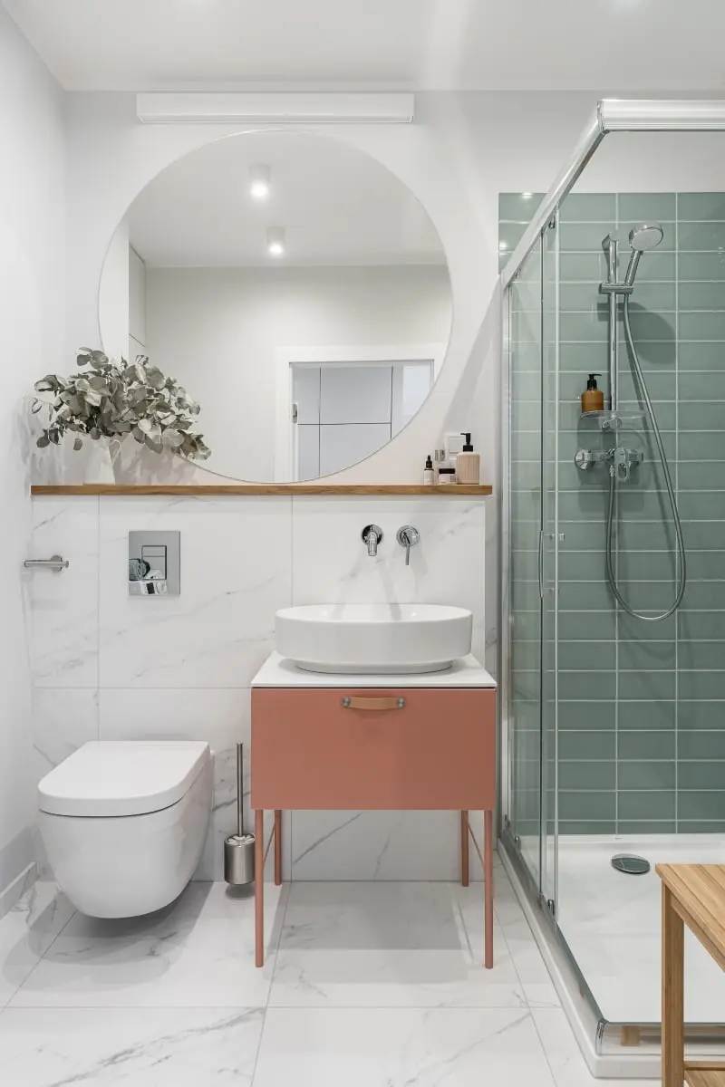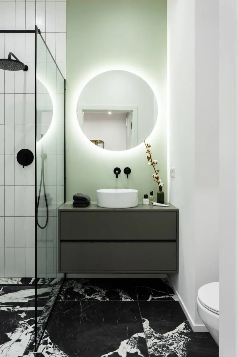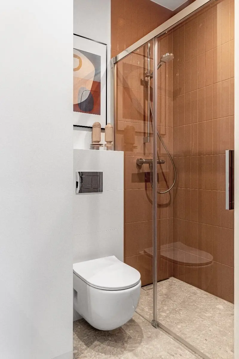 Jednak nie jest to tylko pusty trend. Wykorzystując trik, którego prekursorem był Yves Saint Laurent, możemy w ciekawy sposób zdefiniować wybrany obszar i podzielić wnętrze na strefy funkcyjne. Najłatwiej to zrobić dekorując ścianę, zwykle centralną np. pod prysznicem. Jeden duży obszar w jednym kolorze może naprawdę mieć duży wpływ na przestrzeń, tym bardziej, jeśli użyjesz płytek o dużych rozmiarach lub mniejszych o ciekawym kształcie.
