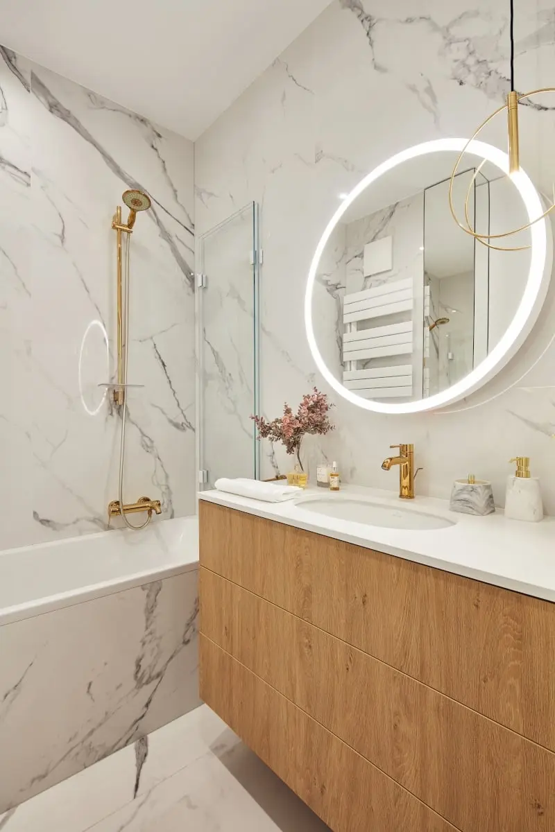 Jeśli jednak bardziej niż szaleństwo przemawiają do Ciebie sprawdzone, klasyczne rozwiązania, postaw na kultowe połączenie marmuru i złota. Gdybyśmy nie wspomnieli we wpisie o tym połączeniu, byłoby to co najmniej podejrzane. Sami wiecie, że regularnie pokazujemy Wam inspiracje łazienkowe z tym motywem w roli głównej. Dlaczego tak jest? Odpowiedź jest prosta. Sami wzdychamy na widok takich projektów. Najbardziej lubimy, gdy aranżację tworzą marmurowe płytki wielkoformatowe dopieszczone złotą biżuteryjną armaturą.
