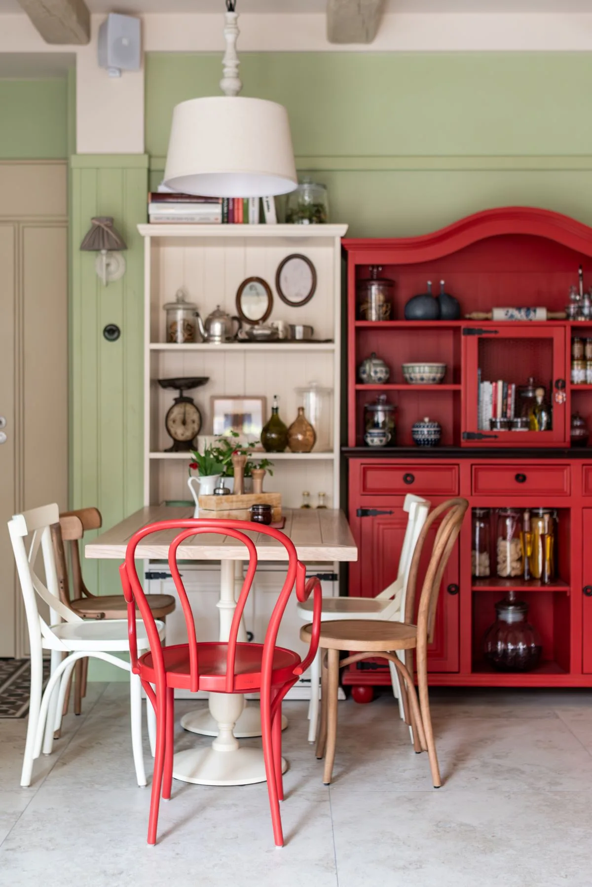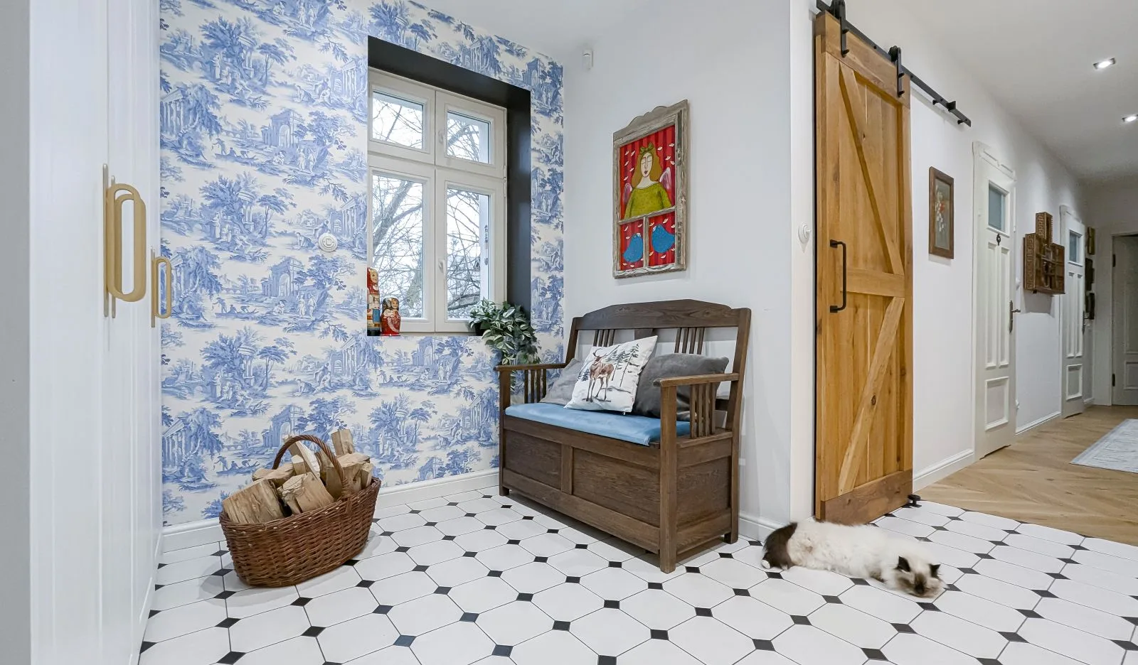 Wnętrza inspirowane estetyką cottagecore cechuje rustykalna stylistyka, która nawiązuje do uroku angielskiej wsi. Głównym założeniem jest stworzenie sielankowej i przytulnej atmosfery, charakterystycznej dla tradycyjnych brytyjskich cottage houses. Kluczową rolę odgrywa tutaj harmonijna, pogodna kolorystyka, w której dominują odcienie błękitu, żółci i czerwieni. Wzory, takie jak pasy, kratki i motywy kwiatowe, są chętnie zestawiane ze sobą, tworząc warstwowe, bogate w detale kompozycje.