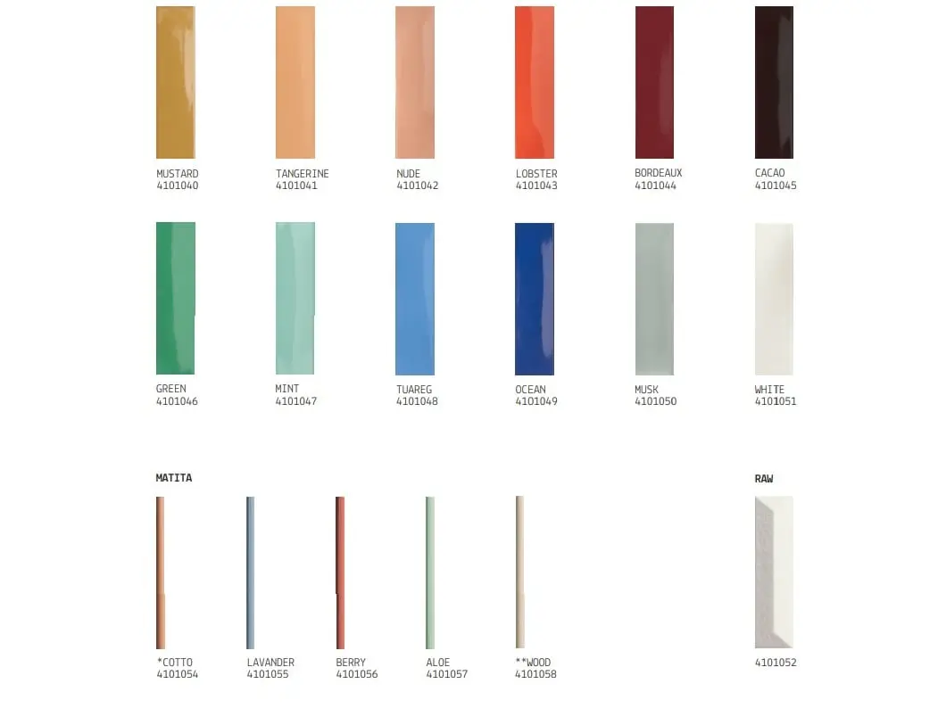 Płytki z kolekcji Kappa 41zero42 dzięki swoim nierównościom, niejednolitej powierzchni szkliwa wyglądają jak produkowane byłby ręcznie. Na tą serię składa się 12 płytek cegiełek w żywych kolorach. Dołączono również jeden trójwymiarowy w surowym wykończeniu element nawiązujący do elewacji budynków z lat 70. Możliwości do komponowania zjawiskowych aranżacji jest wręcz nieograniczona. Kreatorzy z fabryki 41zero42 zawsze podkreślają ważność i moc koloru w przestrzeni. Kolekcja Kappa to czysta energia.