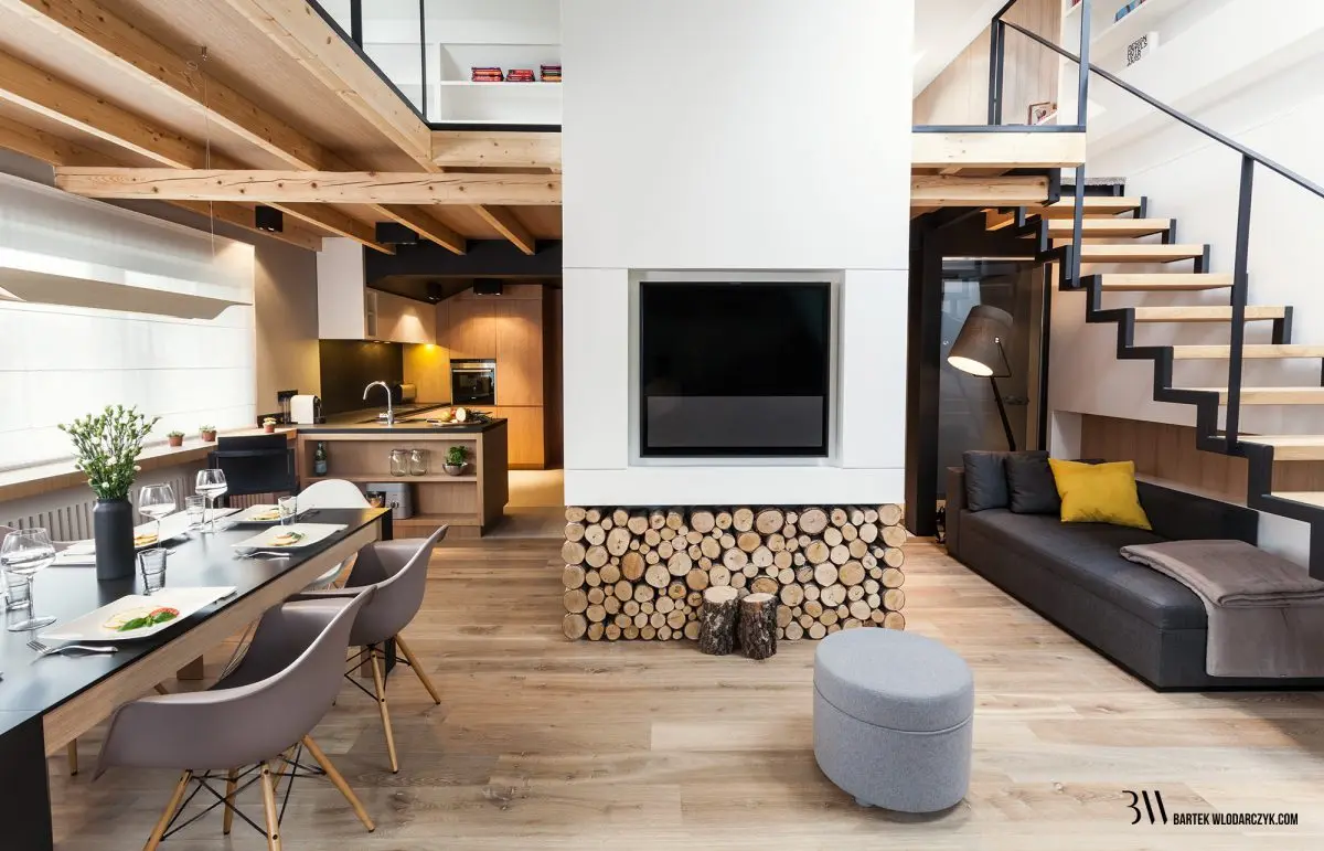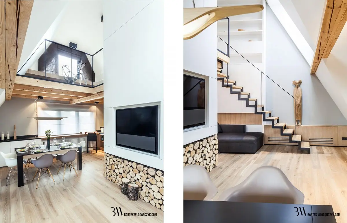 Wyjątkowy dom w Zakopanem o powierzchni 140m2 posiada funkcjonalną piwnicę. Zaaranżowano ją do celów wypoczynkowo-rekreacyjnych i wyposażono w bibliotekę, kino domowe, kominek, saunę winiarnię, a także miejsce do pracy. Apartament na najwyższej kondygnacji budynku w założeniu miał nawiązywać do lokalnych tradycji architektonicznych. Zastosowano w nim wiele miejscowych materiałów oraz dzieł lokalnych artystów. Całość została spięta nowoczesną, modernistyczną stylistyką. Dominują tutaj trzy barwy – biel, beż i szarość oraz naturalne kamienie i drewno.