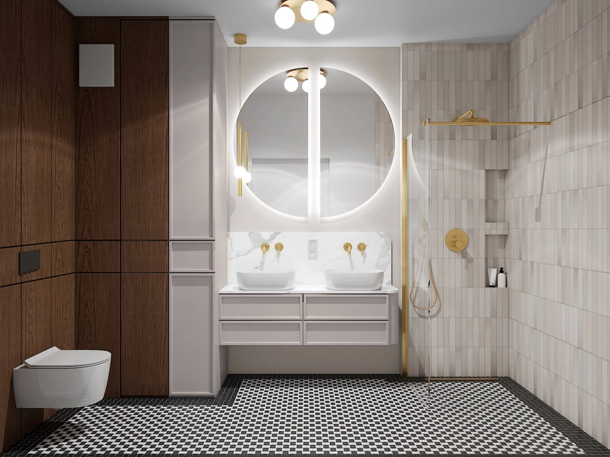 Szczególną uwagę przyciąga łazienka, gdzie mozaika na podłodze nawiązuje do warszawskich gorsecików. Armatura w złotym kolorze doskonale współgra z beżowymi detalami, tworząc kamieniczną elegancję. Zastosowany stelaż Geberit Duofix w połączeniu z fornirem oraz czarnym przyciskiem spłukującym komponuje się doskonale, zachowując jednocześnie funkcjonalność. Umywalki Geberit Variform rekomendowane w projekcie wpisują się w nowoczesny charakter łazienki.
