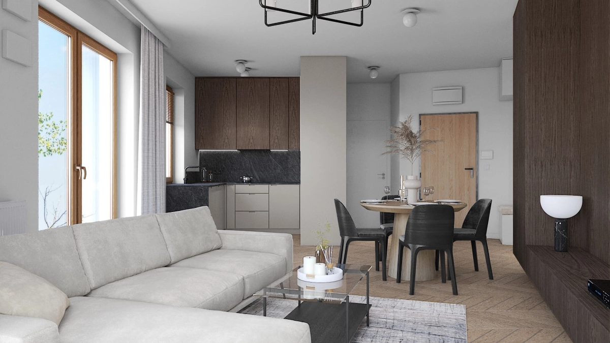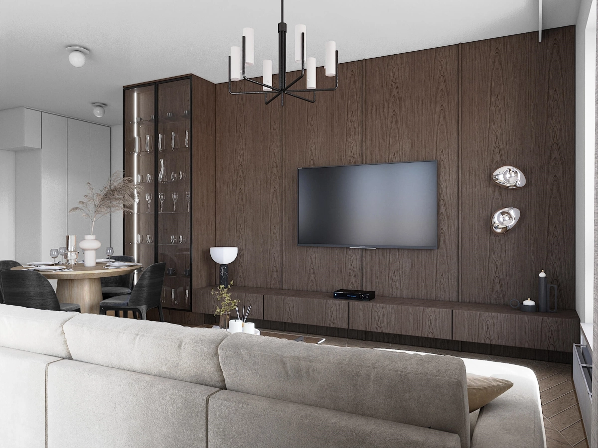 Salon połączony z aneksem kuchennym prezentuje się jako minimalistyczna przestrzeń, gdzie zabudowa fornirowana pełni główną rolę przy strefie telewizyjnej. Monochromatyczny charakter zostaje przełamany szklaną witryną, stanowiącą zarówno element dekoracyjny, jak i dodatkową przestrzeń do przechowywania. Wygodny narożnik z funkcją spania, utrzymany w jasnej tonacji, kontrastuje z eleganckim stołem i zabudową kuchenną, tworząc spójną, a jednocześnie zróżnicowaną aranżację.