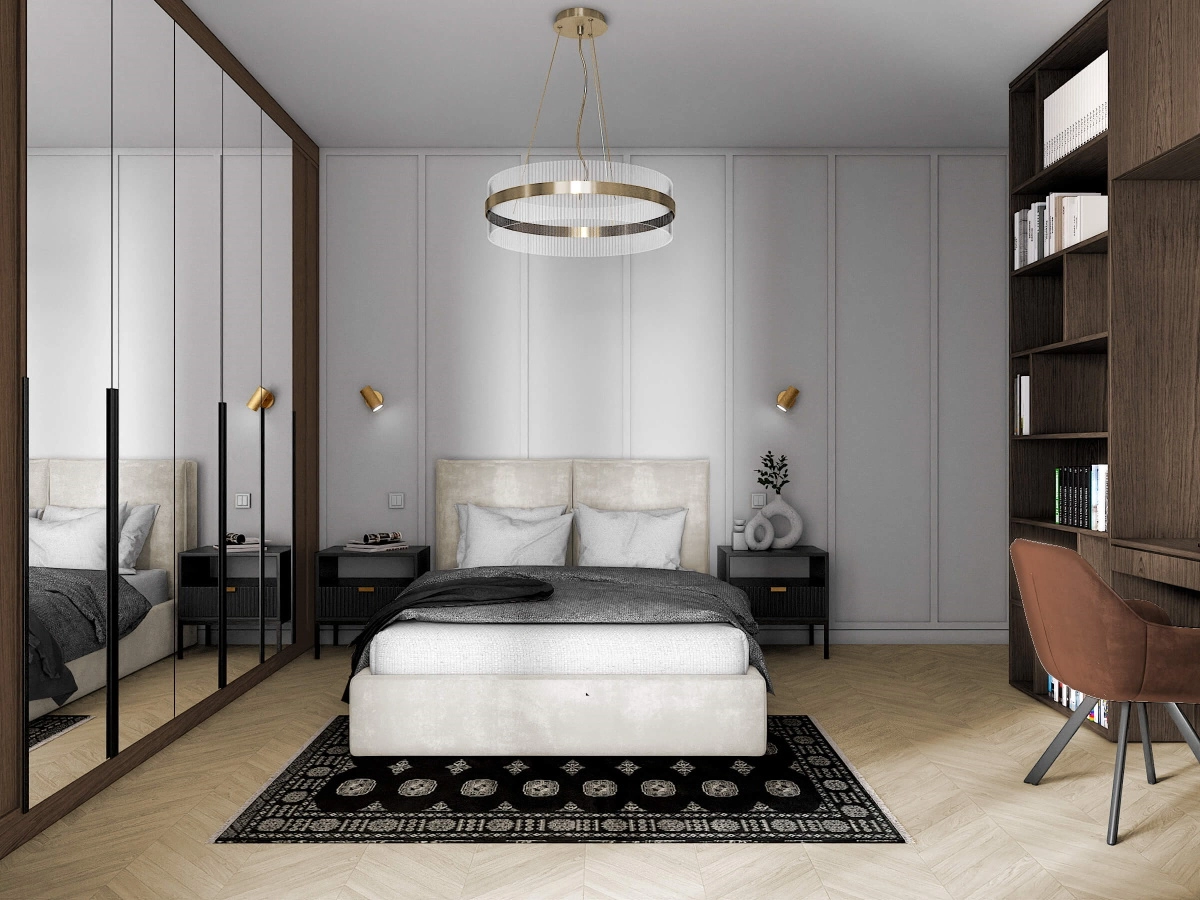 W sypialni dominuje łóżko tapicerowane w beżowej tkaninie, harmonijnie współgrające z lustrzanymi frontami szafy garderobianej. Ten sam fornir pojawia się także w strefie pracy, zamkniętej w funkcjonalnej zabudowie. Zastosowane kontrasty kolorystyczne dodają wnętrzu nowoczesności i elegancji.
