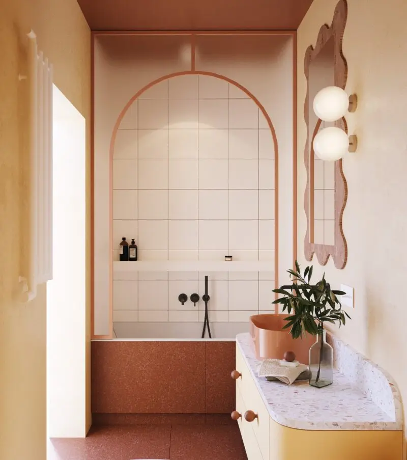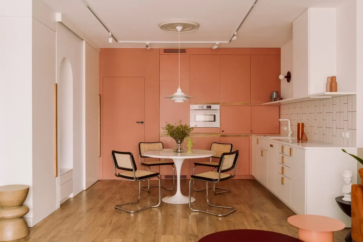 Odcień brzoskwiniowy świetnie komponuje się z białymi elementami w kuchni i łazience. Możesz zastosować go na ścianach, płytkach, a nawet w wyposażeniu takim jak toster, czajnik czy pojemniki na przyprawy. To odświeżający kolor, który wniesie do tych przestrzeni przyjemny akcent.