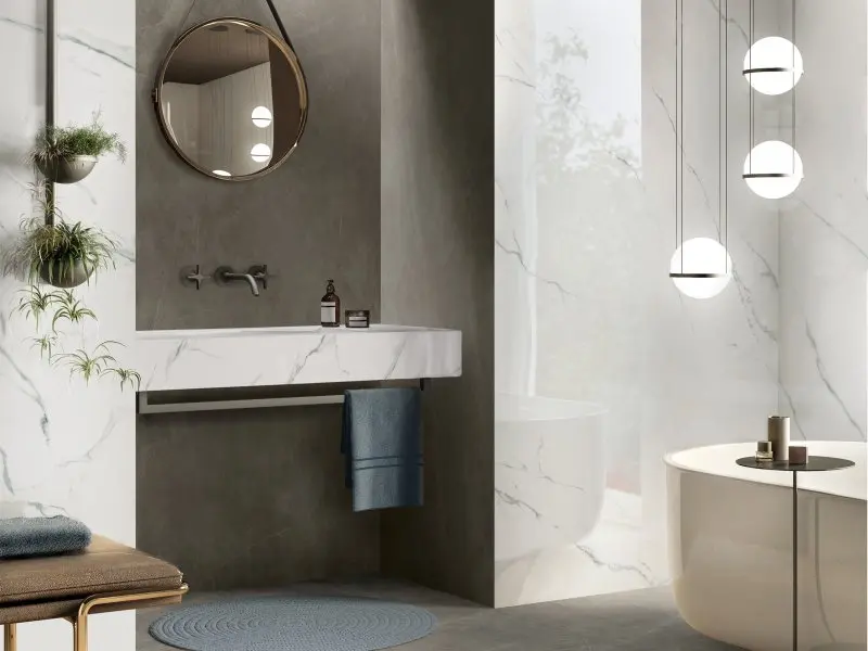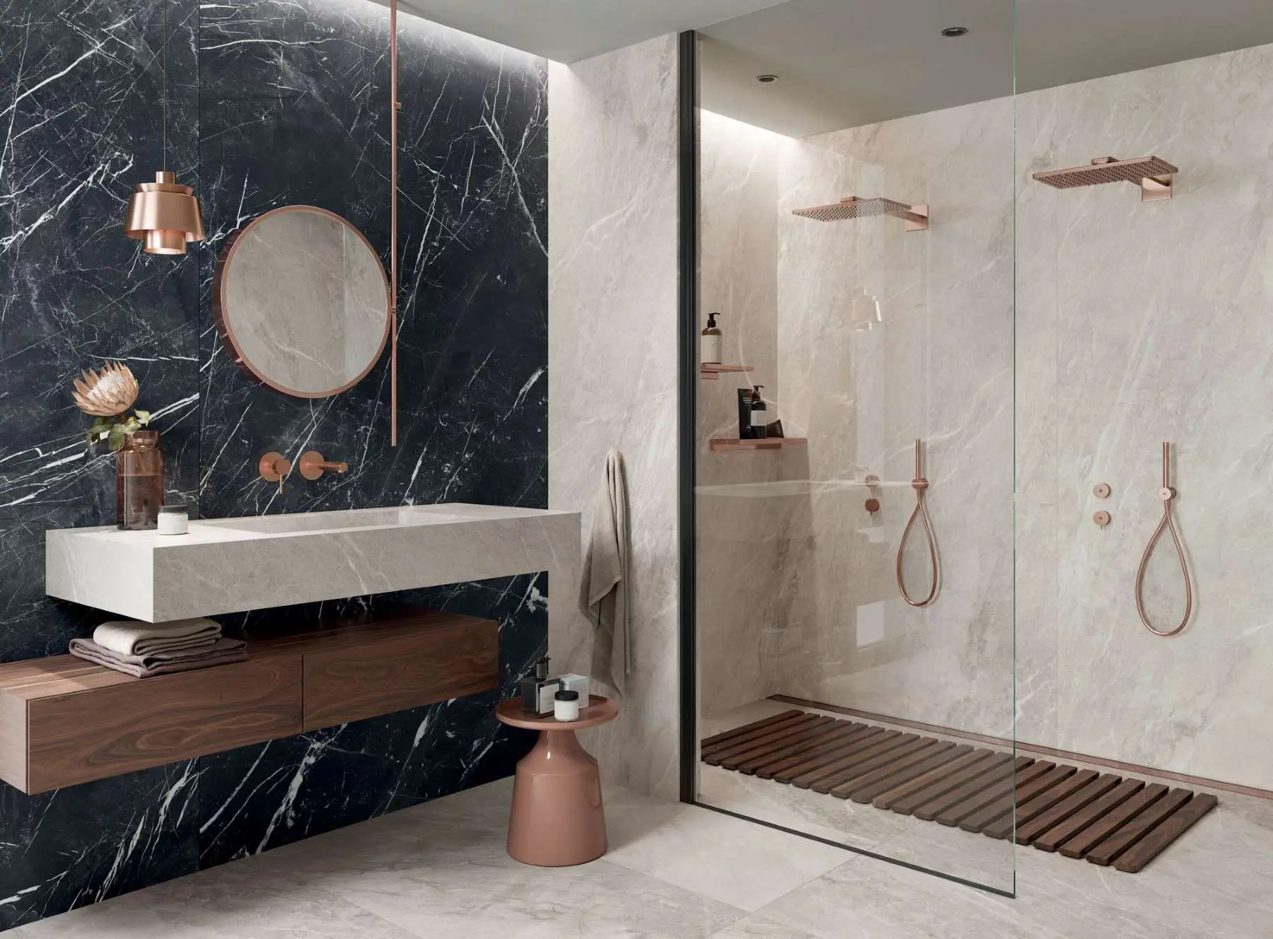Nowoczesna łazienka i wielozadaniowe płytki wielkoformatowe. Obecnie płytki wielkoformatowe dostępne są w kilku rozmiarach, poczynając od 50×100 cm, poprzez 100×100 cm, 160×160 cm aż do 300×100. Oczywiście nie są to jedyne dostępne formaty płytek, bo najodważniejsi z odważnych oferują również płytki w wymiarze 160×320 cm. Im bardziej popularne stają się płytki wielkoformatowe, tym bardziej poszerza się ich oferta i ich kreatywne wykorzystanie w aranżacji łazienki.