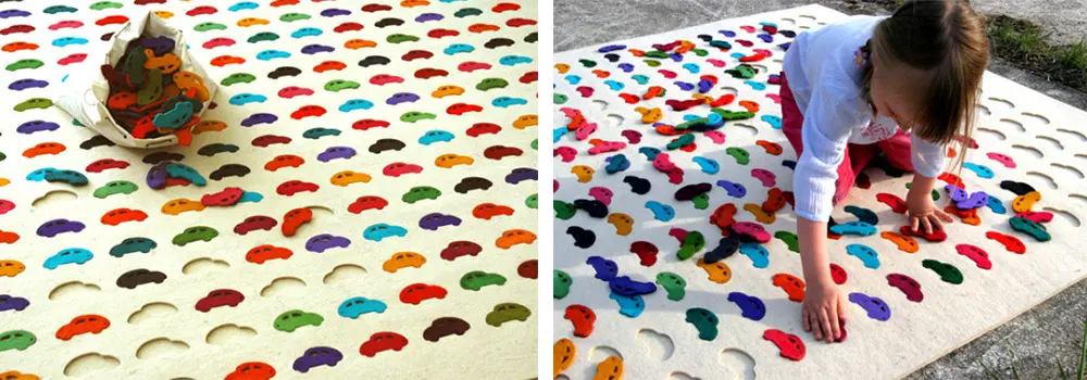 Pastylki – tak nazywa się kolejny interaktywny dywan Joanny Rusin – może sprawić trochę kłopotów, szczególnie jeśli nasze dziecko ma szczególne skłonności do pozostawiania po sobie bałaganu. Jednak pomimo tej drobnej wady, dywan ten jest najbardziej zachęcającym do interakcji wśród wszystkich wymienionych tutaj propozycji. Możliwości ułożenia okrągłych filcowych krążków na dużej dywanowej matrycy można liczyć w setkach tysięcy. To sprawia, że dziecko może za ich pomocą budować własne wzory, napisy, uczyć się budowy kontrastu i kompozycji.