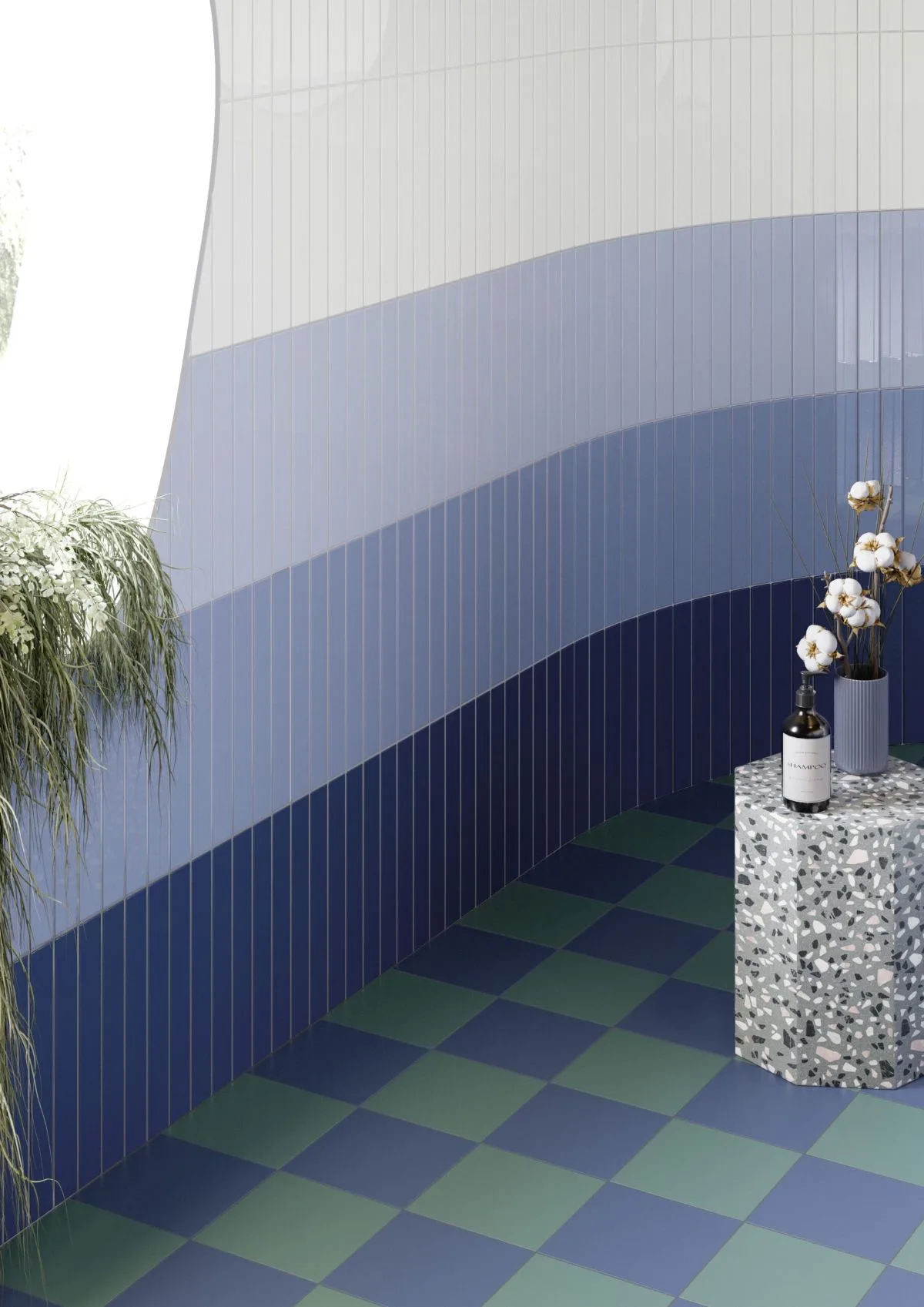 Płytki ułożone w wersji degrade tworzą efekt płynącej barwy. Taka ściana staje się dekoracją samą w sobie – przypomina mural, ale jest trwała i łatwa w utrzymaniu.