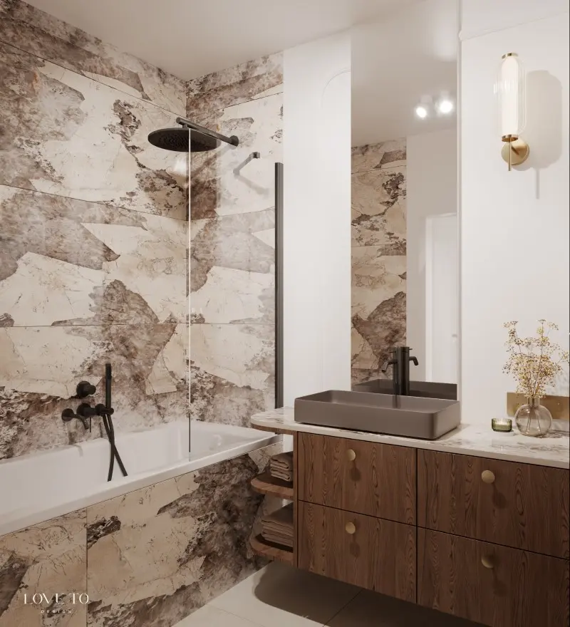 Architektki tworzące pracownię LoveTo Design połączyły piękne płytki wielkoformatowe czerpiące z przeszłości z czarną armaturą i kolorową ceramiką. Ściany otulone szlachetnymi barwami i emanujące majestatycznością marmuru nabrały klasycznego wyrazu dzięki sztukateriom. Subtelne zaokrąglenia łagodzą mocny wzór na ścianach oraz przynoszą poczucie harmonii i spokoju. Całość dopełniają mosiężne dodatki.