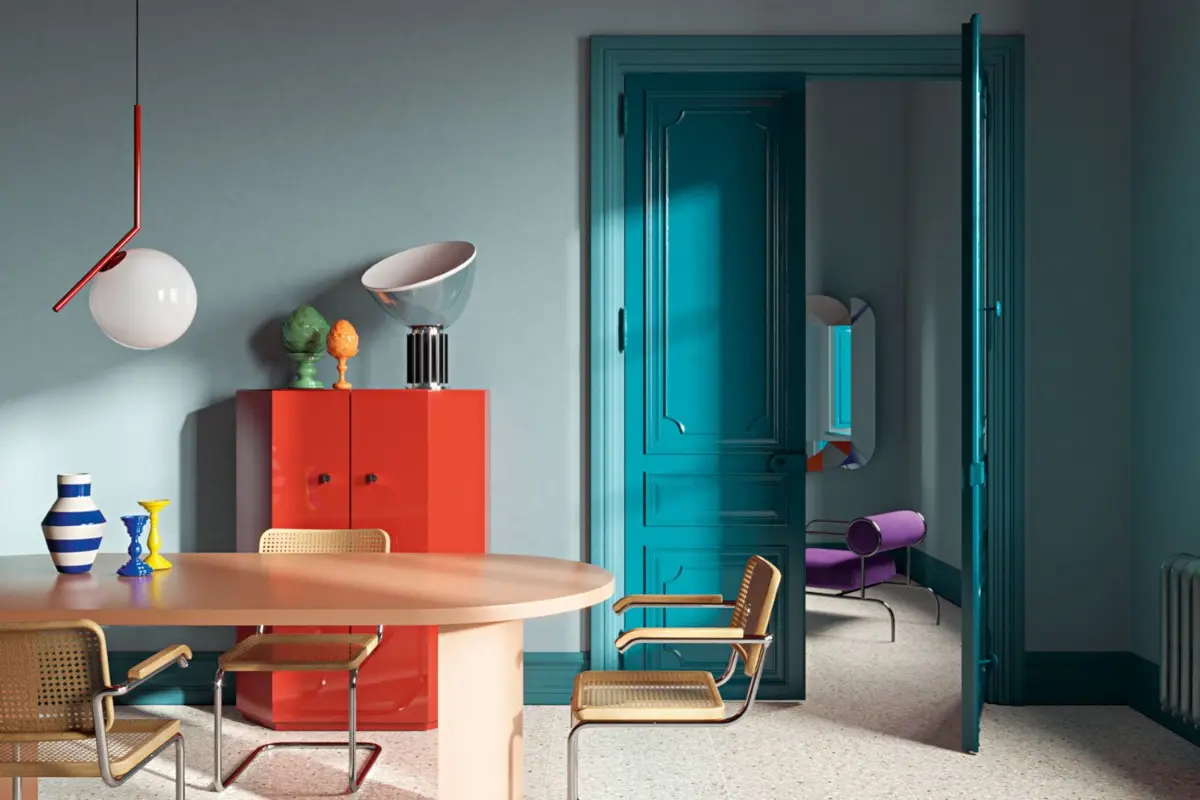 Dla projektów odważnych, dynamicznych i o wyraźnym charakterze WGSN proponuje zestawienia nasyconych, intensywnych barw. Klasyczny przykład to Energy Orange + Ultra Pink – połączenie pomarańczu i różu tworzy kontrastową kompozycję o wysokiej energii wizualnej. Estetycznie wpisuje się ona w stylistykę pop art, a także w nurt „dopamine dressing”, promujący kolor jako narzędzie poprawy nastroju.