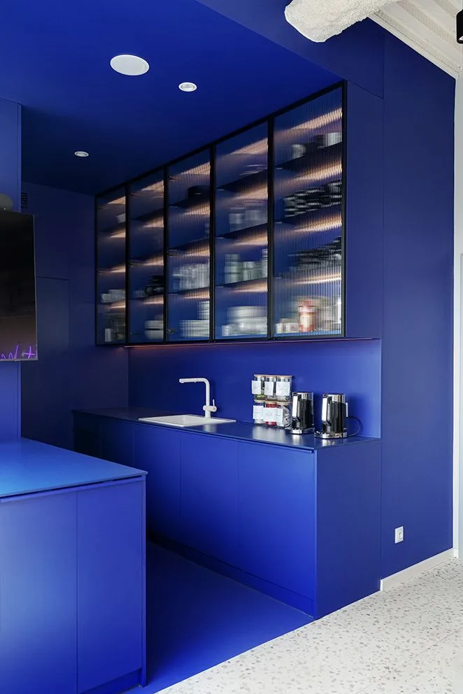 Luminous Blue dobrze współgra z różnorodnymi materiałami i wykończeniami – może kontrastować z chłodnymi neutralami (np. stal nierdzewna, beton), tworząc ultranowoczesny efekt, lub harmonizować z teksturami w stylu vintage: aksamitem, naturalnym drewnem, ceramiką. W zależności od kontekstu może funkcjonować jako punkt centralny kompozycji albo nowoczesny odpowiednik neutralu – „nowa czerń”, którą łatwo wkomponować w zróżnicowane palety i koncepcje projektowe.
