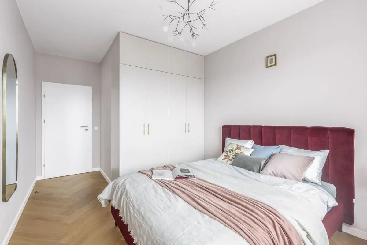 Ciekawym rozwiązaniem jest położenie czerwonych paneli tapicerowanych na ścianie za łóżkiem. Sprawiają, że sypialnia staje się przytulna, a dodatkowo poprawiają izolację akustyczną.