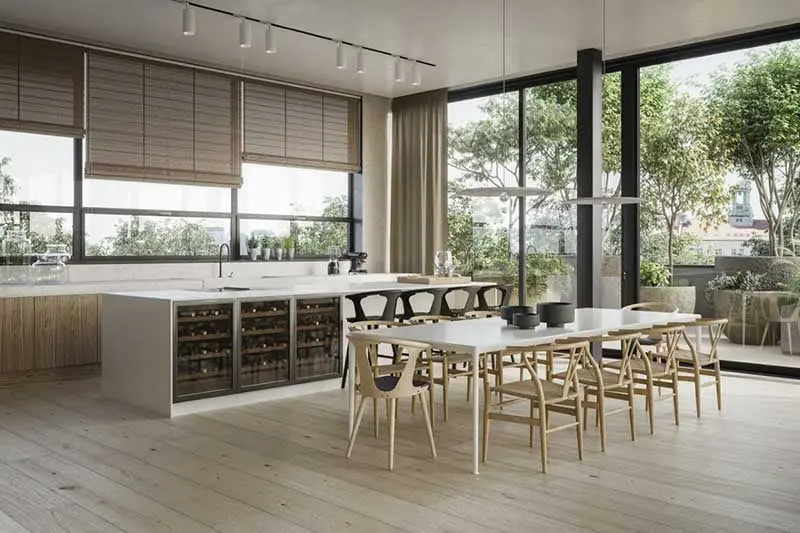 Uniwersalność i różnorodność tekstur płyt wielkoformatowych sprawia, że aranżacja kuchni w stylu Japandi staje się prosta i przyjemna. Materiał ten charakteryzuje się wysoką trwałością oraz odpornością na uszkodzenia i inne czynniki, z którymi na co dzień mamy do czynienia w kuchni. Dlatego płyty wielkoformatowe idealnie sprawdzą się przy realizacji wyspy kuchennej, blatów roboczych, wykończenia ścian nad nimi oraz pokrycia podłogi. Wśród szerokiej gamy dostępnych tekstur można wybierać spośród wzorów inspirowanych marmurem, granitem, cegłą, betonem czy motywami roślinnymi.