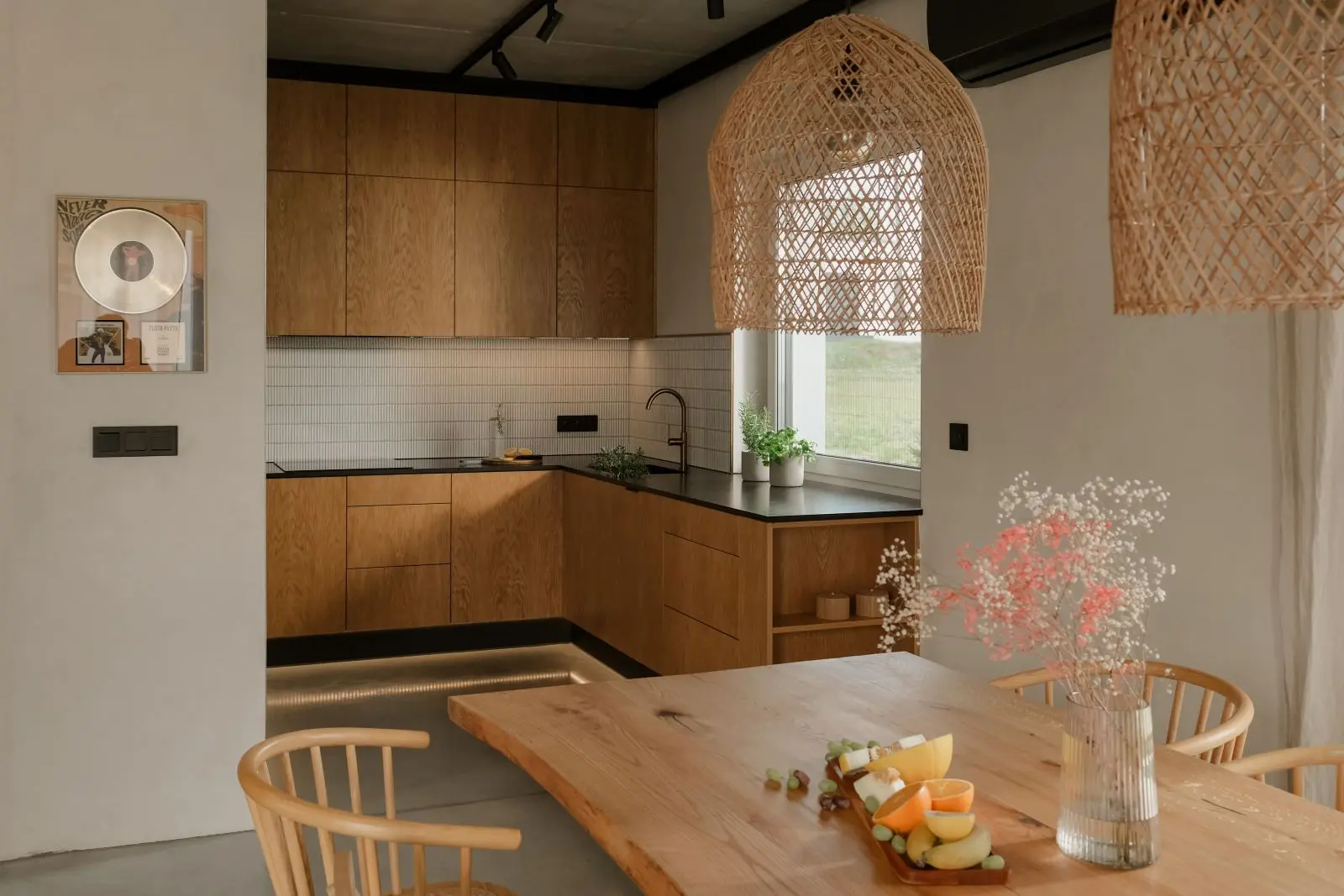 Styl Japandi, czerpiący inspirację z filozofii wabi-sabi, oferuje nowoczesną interpretację rustykalnego klimatu. Nieregularne kształty, powierzchnie naznaczone upływem czasu oraz chropowate tekstury nadają kuchni unikalny charakter, zachowując jednocześnie minimalistyczną estetykę. W tej aranżacji kluczową rolę odgrywają drewniane elementy z wyraźnym rysunkiem słojów, uzupełnione przez spieki o wabi-sabi teksturze, deski do krojenia eksponowane na blacie oraz ceramiczne naczynia. Drewniany stół lub hokery o nieregularnych kształtach stanowią efektowny akcent, podkreślając rustykalny, a jednocześnie nowoczesny sznyt wnętrza.