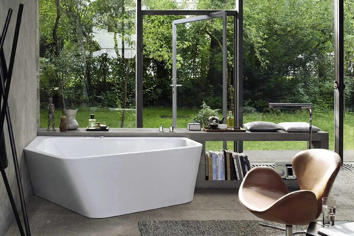 Kolejnym hitem serii XViu jest wolnostojąca wanna, z przyciągającym uwagę industrialnym stelażem. Widoczna jest metalowa rama z profilem w kształcie litery V, która występuje w kolorze Szampan Mat lub Czarny Mat, jako kontrast do białego akrylu o wysokim połysku. Rama podtrzymuje wolnostojącą wannę (dwa rozmiary: 160×80 cm i 180×80 cm), która oglądana z góry tworzy dokładny prostokąt, z ergonomicznym i organicznym wnętrzem. Precyzyjne wykończenie i doskonała estetyka, jak również subtelnie zintegrowany odpływ, podkreślają wyrafinowaną konstrukcję.