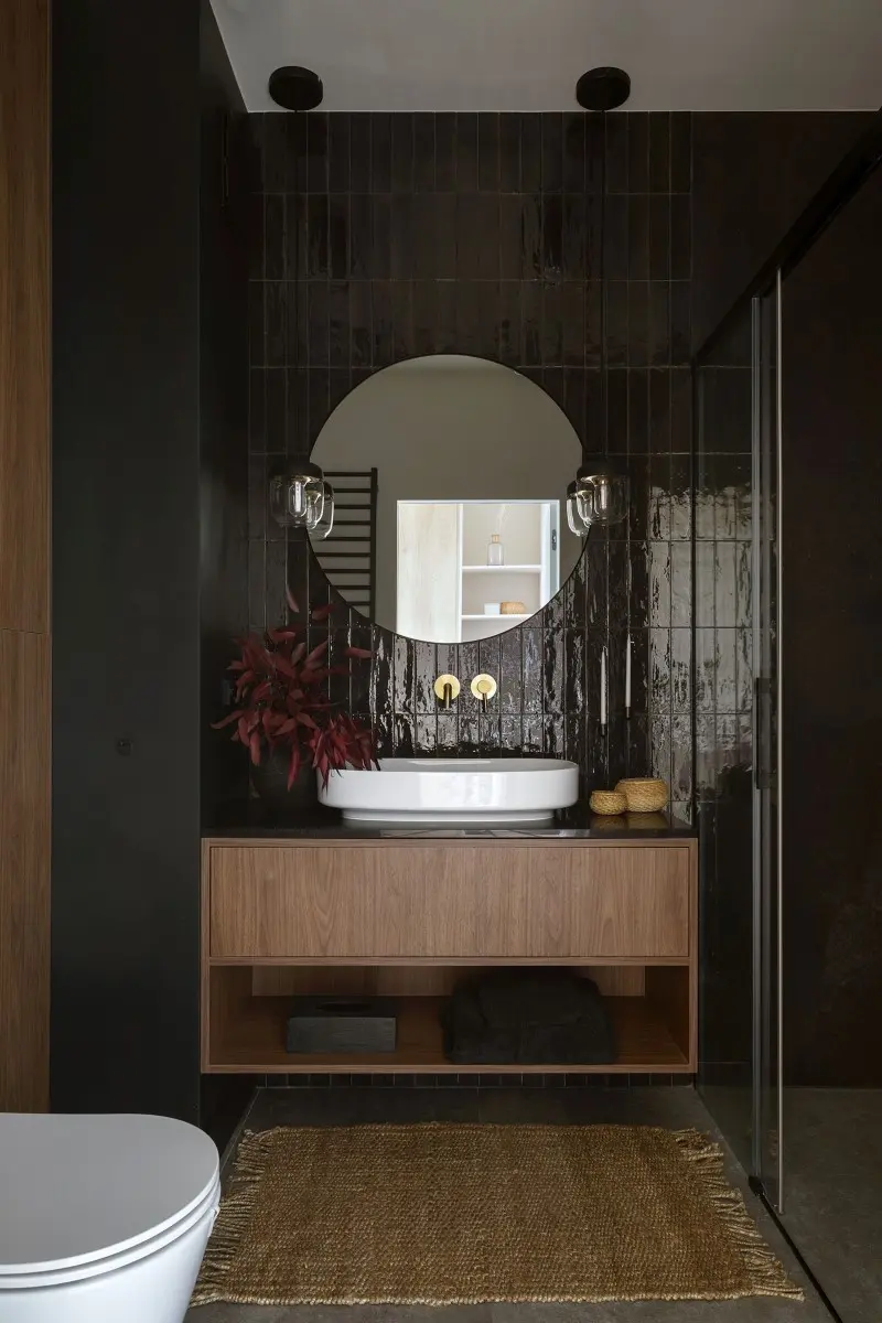 Ciemne kolory używane w Dark Japandi nadają przestrzeniom intymnego, otulającego charakteru. Dzięki warstwowemu wykorzystaniu różnych odcieni, wnętrza stają się dynamiczne i zmieniają się wraz z grą światła i cienia w ciągu dnia.