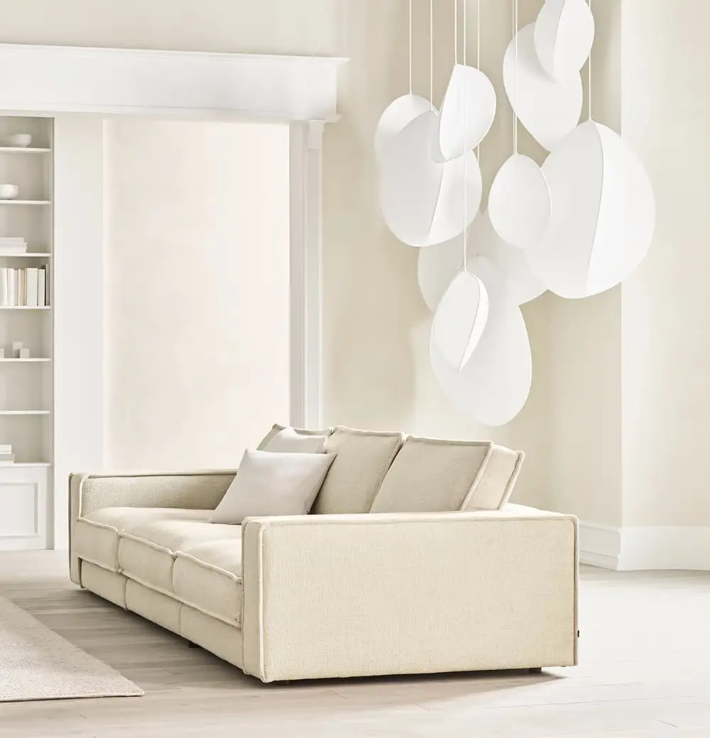 Warta uwagi jest też efemeryczna lampa wisząca Lunaria, która zaprojektowana jest tak, by mogła wisieć samodzielnie lub w grupie. Model dostępny w trzech rozmiarach, wykonany jest z ekranów pokrytych tkaniną. Po zestawieniu większej ilości lamp, otrzymujemy instalacje przywodząca na myśl bardzo modną w ostatnich latach roślinę – lunarię, znaną również pod nazwą srebrniki judaszowe.