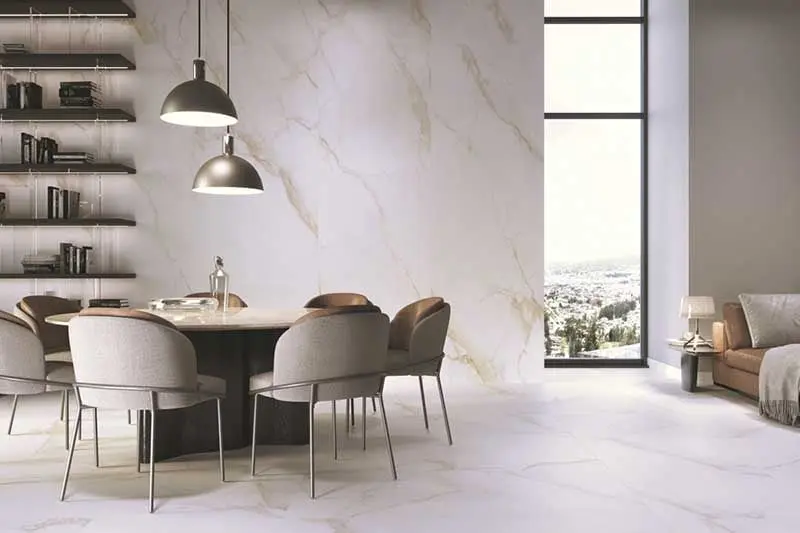 Saria Marmi zachwyci fanów naturalnego kamienia. Znajdziemy tutaj białe powierzchnie o delikatnym szarym lub złotym użyleniu w wersji matowej lub polerowanej. Natomiast dzięki różnorodności rozmiarów (60×120, 120×120, 120x260cm) można idealnie dobrać płytkę do projektu. Wielkie formaty zapewnią piękną monolityczną powierzchnię ścian i podłóg, ale sprawdzą się również jako obudowa wysp kuchennych, blatów czy wanien. Płytki z serii Oak oraz Marmi świetnie wyglądają zestawione ze sobą, a ich duet pozwala stworzyć harmonijne i przytulne wnętrze w duchu japandi czy New Nordic.