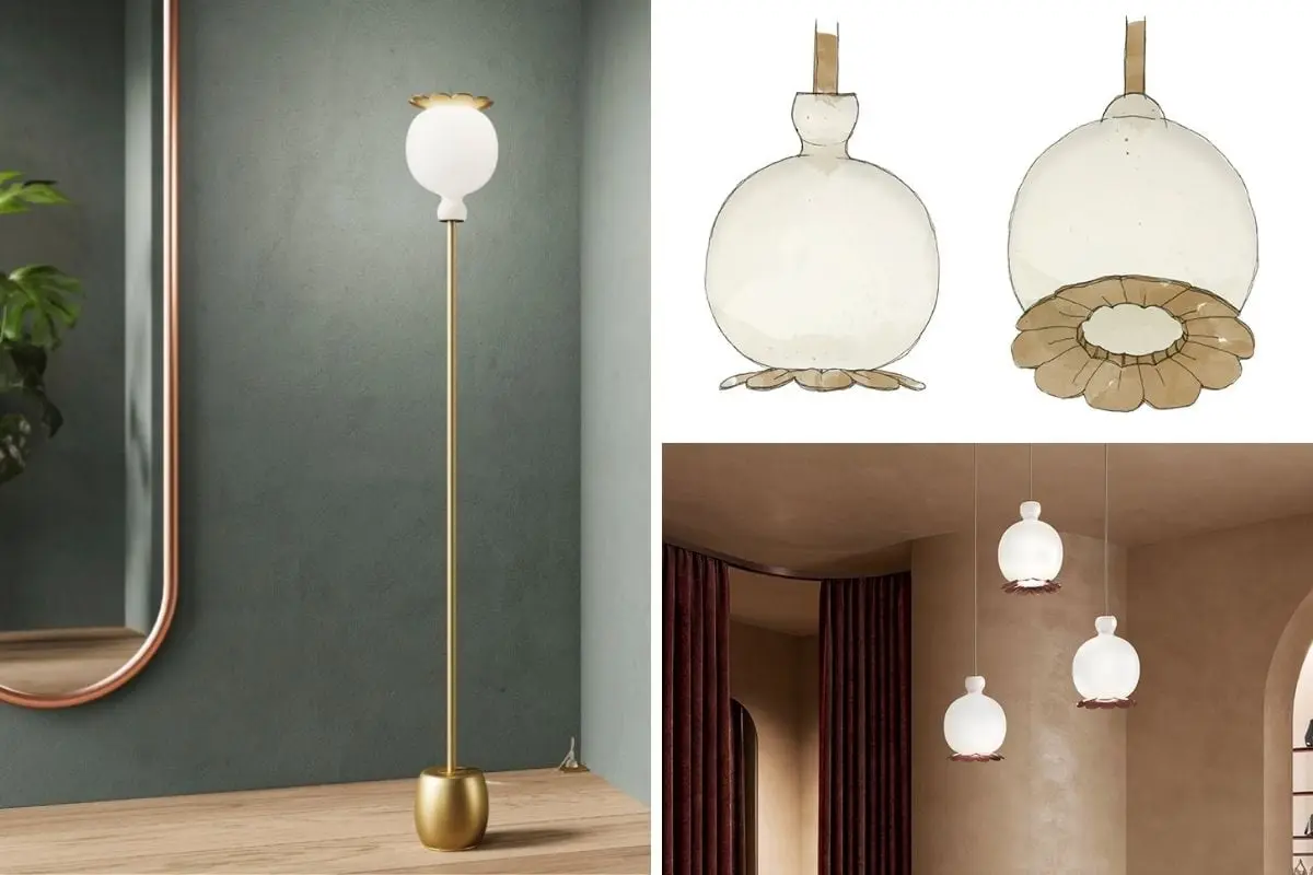 Drugą kolekcją, jaka przykuła nasza uwagę jest seria OPYO, autorstwa Cristiny Celestino. Za projektem stoi natura, wraz z jej pięknymi i zaskakującymi formami. Projektantka wykorzystała kształt pąków maku, by stworzyć piękny klosz, wieńczący lampy wiszące oraz podłogowe.