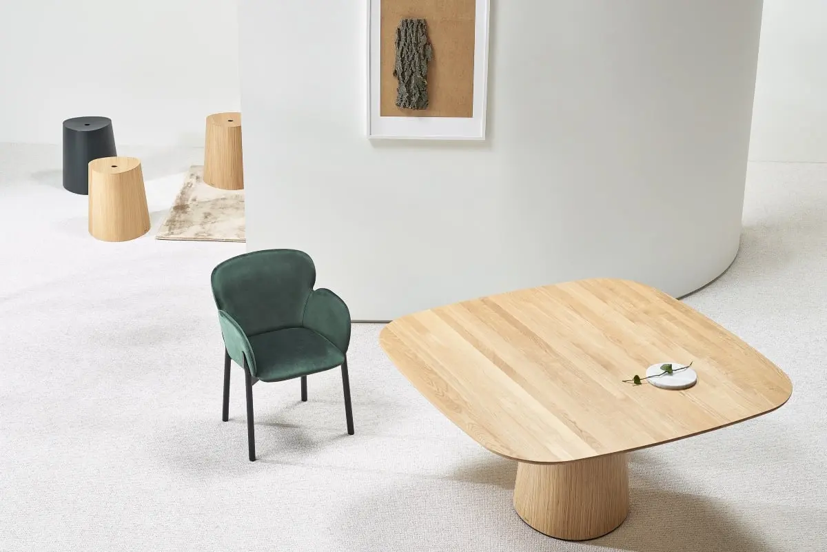 Niepozorny wygląd, minimalistyczny look oparty o organiczne formy, subtelne echa stylu japandi … Nowa kolekcja marki TON może wydawać się niepozorna, jednak kryje się w niej ogromny potencjał. Stoły i taborety z serii P.O.V z łatwością są w stanie skupić na sobie uwagę, stając się gwiazdą aranżacji. Wszystko zależy od wybranego punktu widzenia  – stąd nazwa – Point Of View. O charakterze kolekcji decyduje przede wszystkim zastosowany materiał i kształt podstawy, powstałej przez złożenie trzech identycznych arkuszy sklejki, które stanowią spójny element całej rodziny stołów. Modele występują w dwóch wysokościach, z trzema typami podstaw i sześcioma kształtami blatów. Łącznie ten modułowy system zawiera dziesiątki wariantów, dzięki czemu nadaje się do każdego rodzaju wnętrz – biur, jadalni, kawiarni i restauracji. Uzupełnieniem jest taboret o tej samej nazwie, będący funkcjonalnym i zabawnym elementem pokoju. Kolekcja oferowana jest w trzech gatunkach drewna: buku, dębie i orzechu amerykańskim, które mogą być wykończone w różnych kolorach.