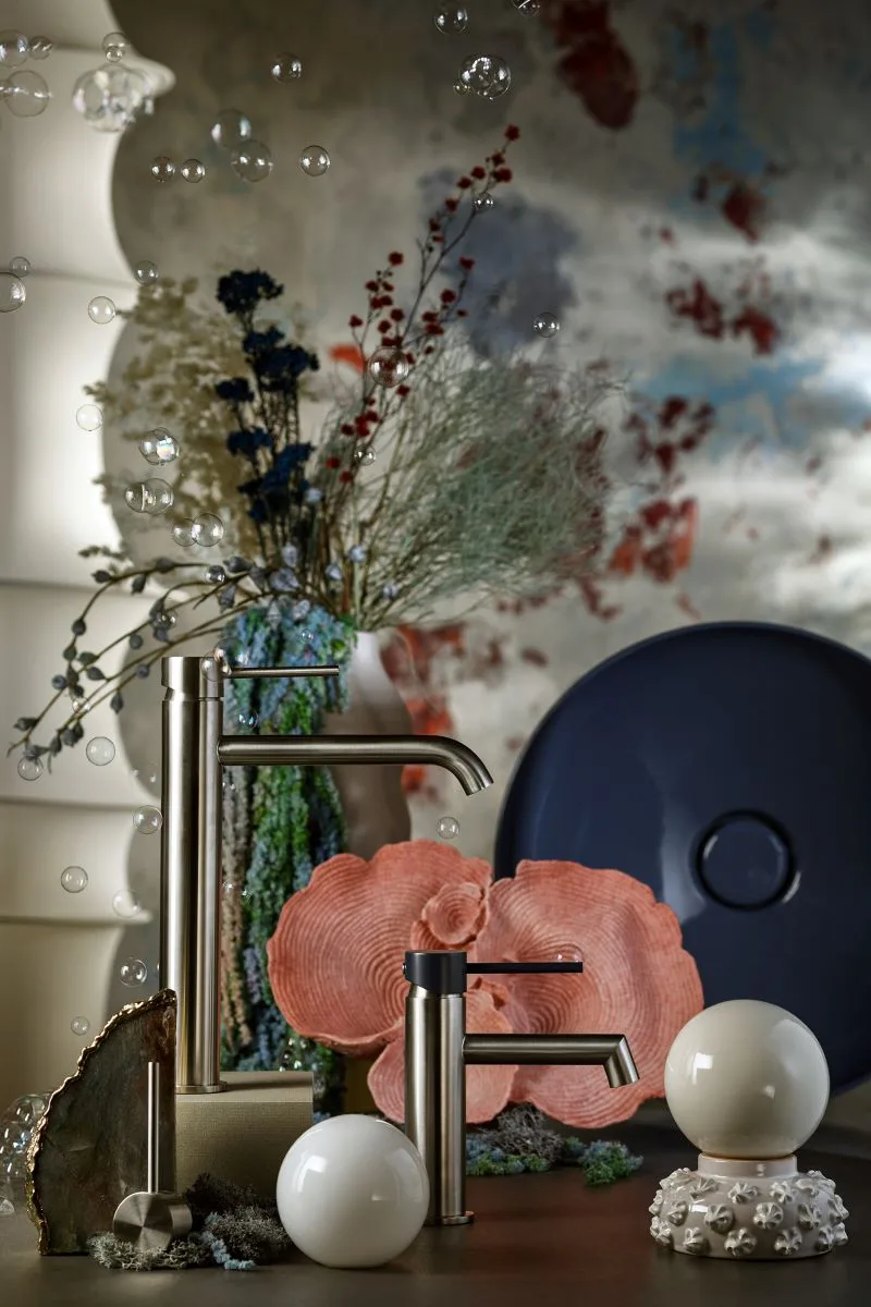 Tworząc koncepcję najnowszej sesji fotograficznej, pragnęliśmy wyjść poza dotychczasowe schematy prezentacji produktów łazienkowych. Naszym celem było stworzenie czegoś intrygującego i hipnotyzującego – wizji, która zdecydowanie odbiega od kampanii marek z sektora sanitarnego. Inspiracją stały się trzy, pozornie odległe, światy: japońska sztuka ikebany, surrealizm oraz grafiki generowane przez sztuczną inteligencję.