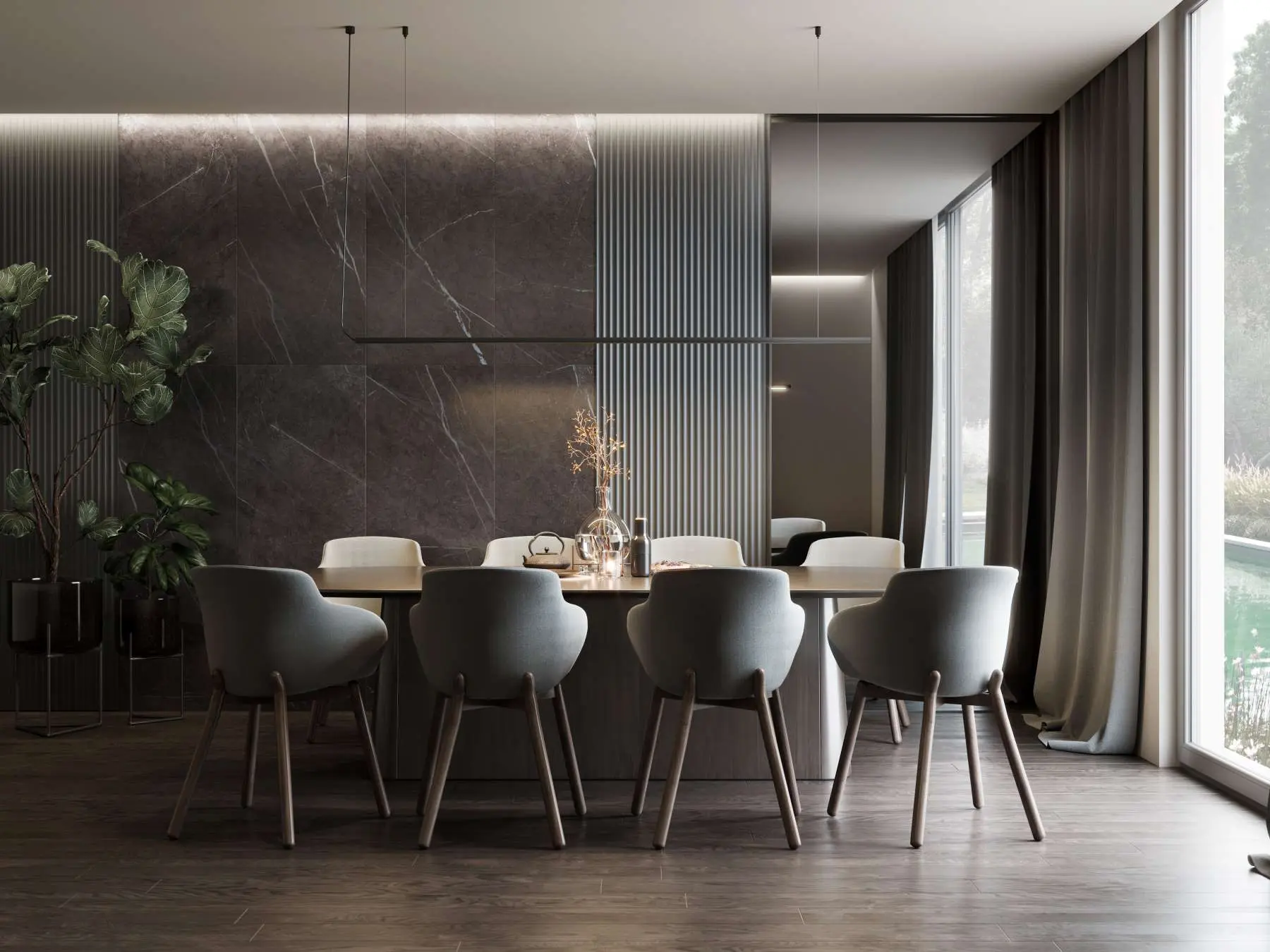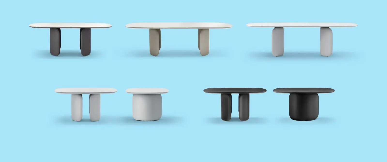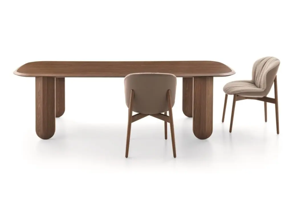 Kolekcja stołów Elinor, o miękkich, zaokrąglonych liniach. Projektantem stołu jest Claudio Bellini. Podstawę tworzą dwa elementy odlewane o stałych wymiarach, wykonane z pianki poliuretanowej i obite naturalną skórą. Pootrzymuj one super cienki blat z laminatu o grubości 6 mm lub białego szkła.