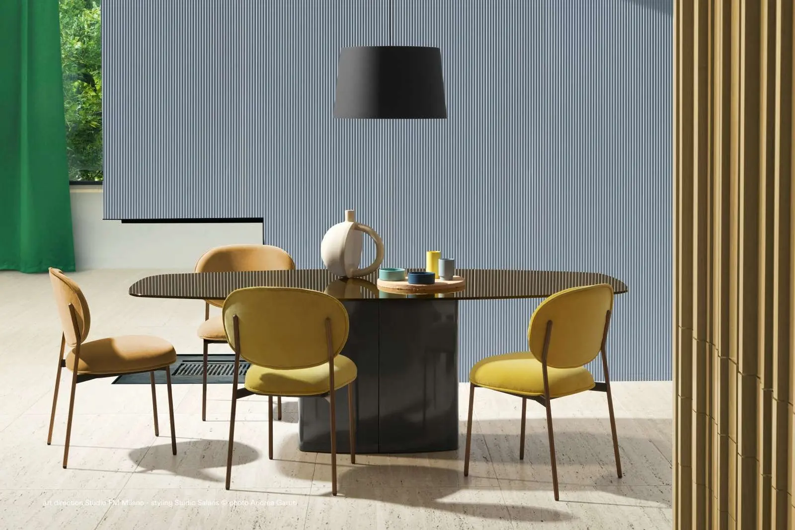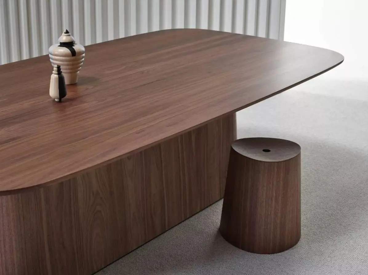 Stół z kolekcji TON P.O.V charakteryzuje się centralną podstawą o długości 172,5 cm, która zapewnia stabilność. Blat stołu dostępny jest w trzech kształtach: owal, prostokąt oraz prostokąt z zaokrąglonymi rogami. Wykonany z drewna buku, dębu lub orzecha amerykańskiego oraz wykończony w różnych kolorach.