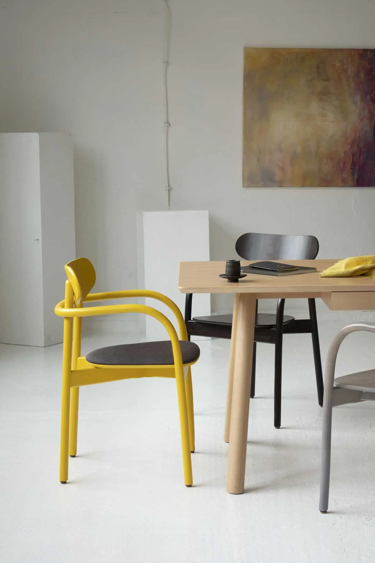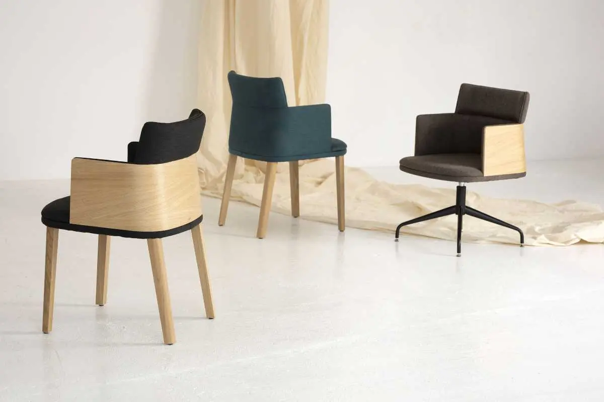 HOLO łączy niekonwencjonalne wzornictwo z nowym sposobem siedzenia: niższa część oparcia i podłokietników została wycięta, pozwalając użytkownikowi na swobodne poruszanie się wewnątrz mebla i wygodne ułożenie ciała. Ma to także duże znaczenie dla estetyki – ten zabieg zapewnił fotelowi HOLO wizualną lekkość i delikatnie buntowniczy charakter. Fotel wciąż pozostaje eleganckim meblem, rozwijając jednak ten koncept o nowe wartości, właściwe dla rytmu codzienności i wielkomiejskiego stylu życia. HOLO jest oferowany w dwóch wariantach wykonania podstawy: metalowej, przeznaczonej do powierzchni korporacyjnych, a także drewnianej, perfekcyjnie pasującej do wnętrz kawiarni, hoteli i restauracji.