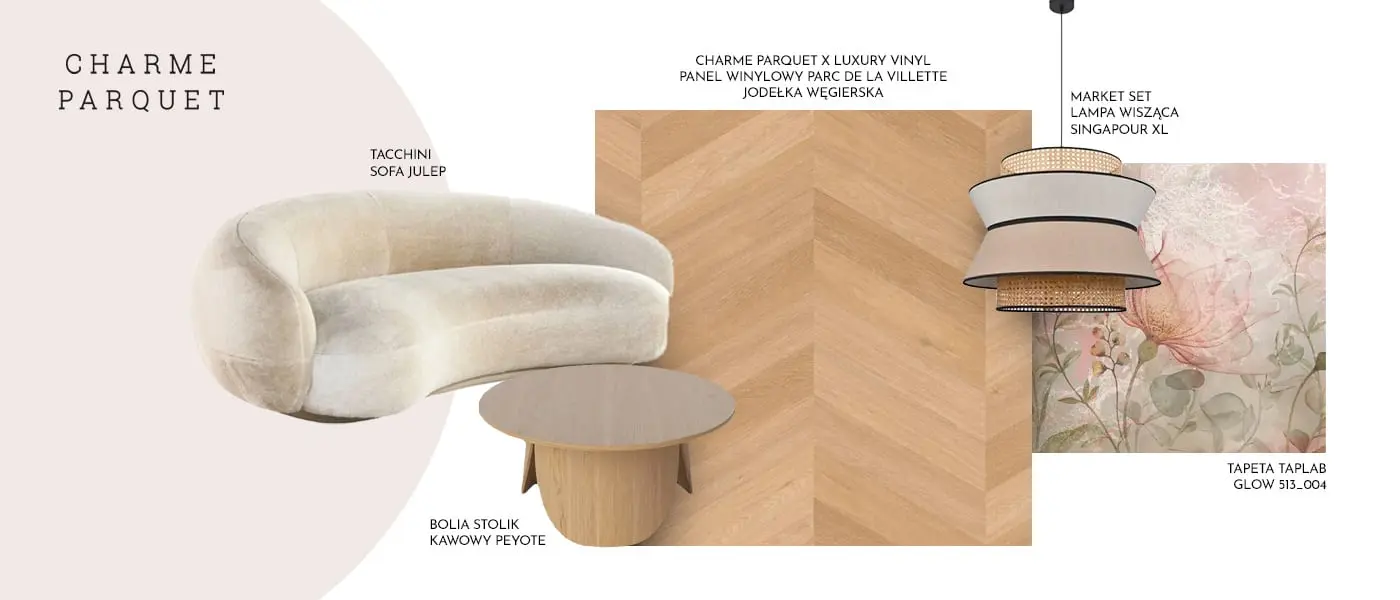 Letnia aranżacja wnętrza przynosi nam na myśl jasne kolory, które optycznie odbijają światło i dodają przestrzeni wrażenia świeżości. Powinniśmy postawić na wybór lekkich tkanin, takich jak len, bawełna lub aksamit. Te materiały są przewiewne i doskonale pasują do letniego wystroju. Idealnym dopełnieniem będą również elementy związane z naturą. Dobrym krokiem będą meble lub ozdoby wykonane z naturalnych materiałów, takich jak rattan, wiklina lub drewno. Meble inspirowane naturą nadadzą salonowi przytulny i letni charakter. Zwieńczeniem tej przeuroczej lekkiej i letniej aranżacji wnętrza są panele winylowe CHARME PARQUET X LUXURY VINYL PARC DE LA VILLETTE ułożone w ponadczasową jodełkę węgierską.