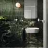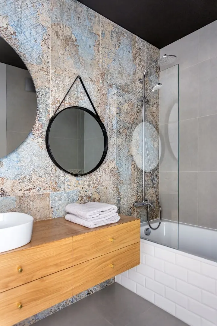 Inspiracje japońską filozofią wabi – sabi są widoczne również w projektach łazienek, czego jednym z przykładów są płytki z przecieraną fakturą. Ich niedoskonałe piękno wprowadza do wnętrza niepowtarzalny klimat i pozwala stworzyć aranżację daleko wykraczającą poza utarty standard. Tak charakterny element, najlepiej zastosować tylko na wybranej części, reszta powinna być raczej stonowana.
