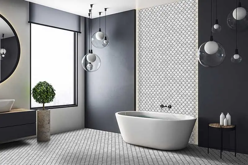 Contemporary bathroom interior with city view and copy space on wall. 3D Rendering