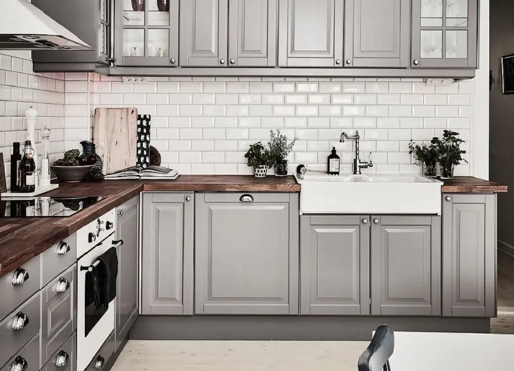 Białe płytki nad drewnianym blatem w szarej kuchni to wybór na 100% idealny. Zobaczcie efekt!