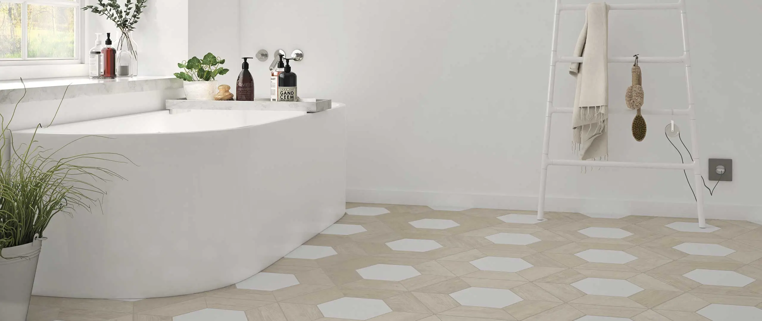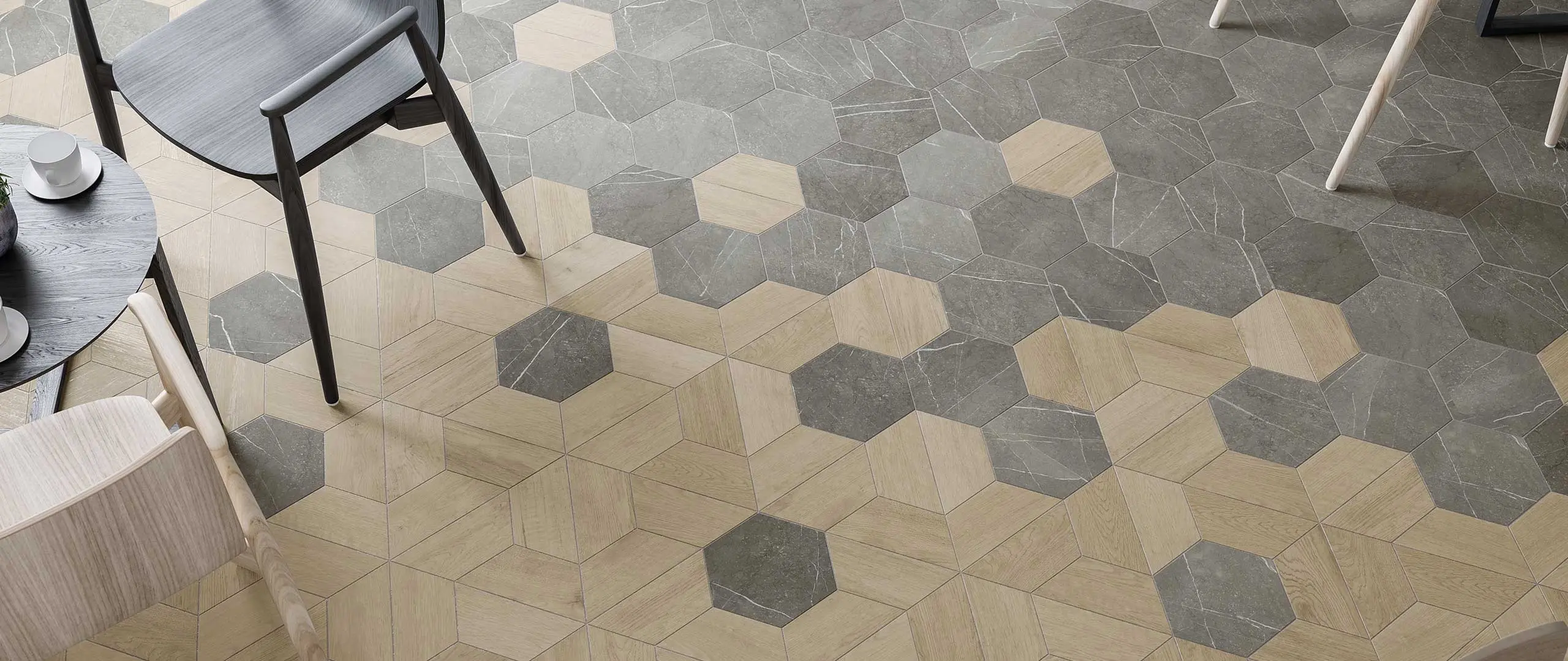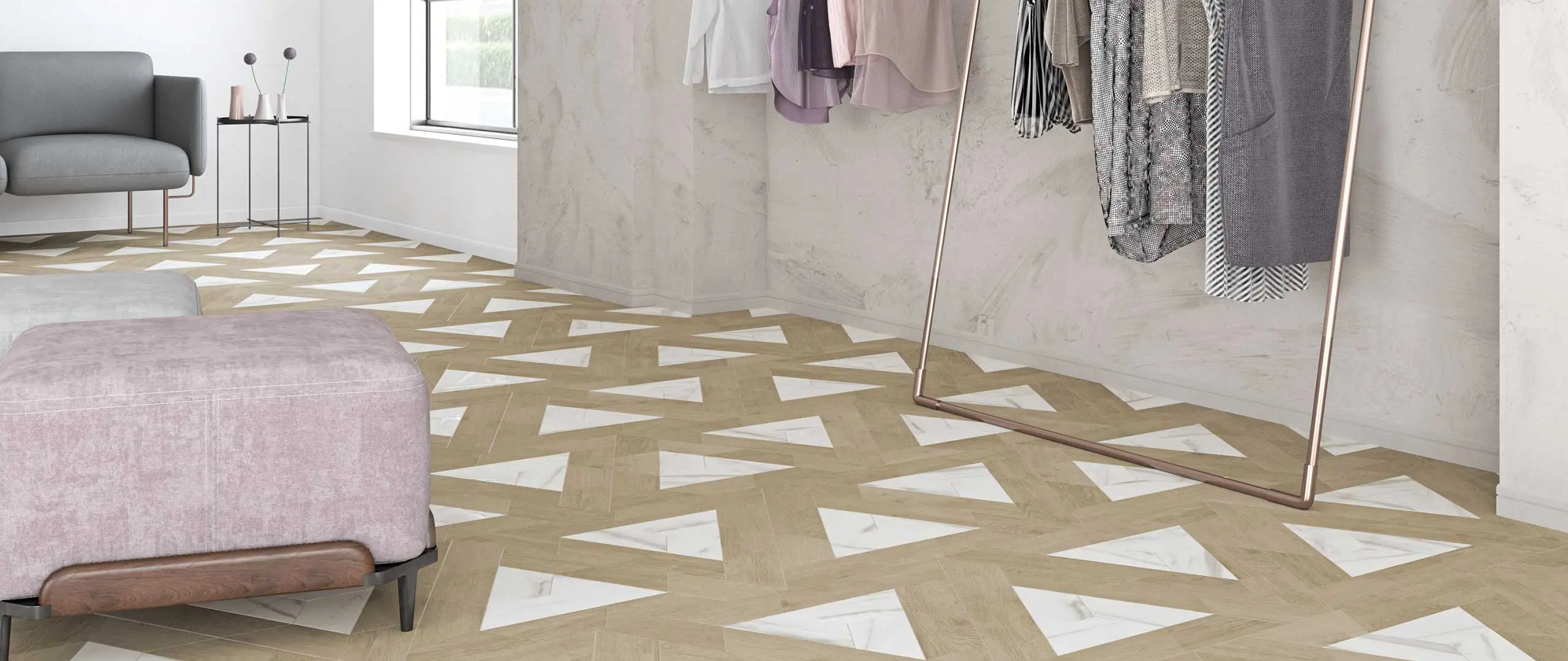 Zestawienie kształtów chevronu i trapezu, które są cięte pod kątem 60 °, pozwala na zaaranżowanie dowolnej kombinacji na podłodze lub ścianie. Nie trzeba też ich łączyć, świetnie wyglądają solo. Trzy naturalne odcienie drewna i kamień inspirowany calacatta, podkreślają niezwykłą elegancję kolekcji 60º.