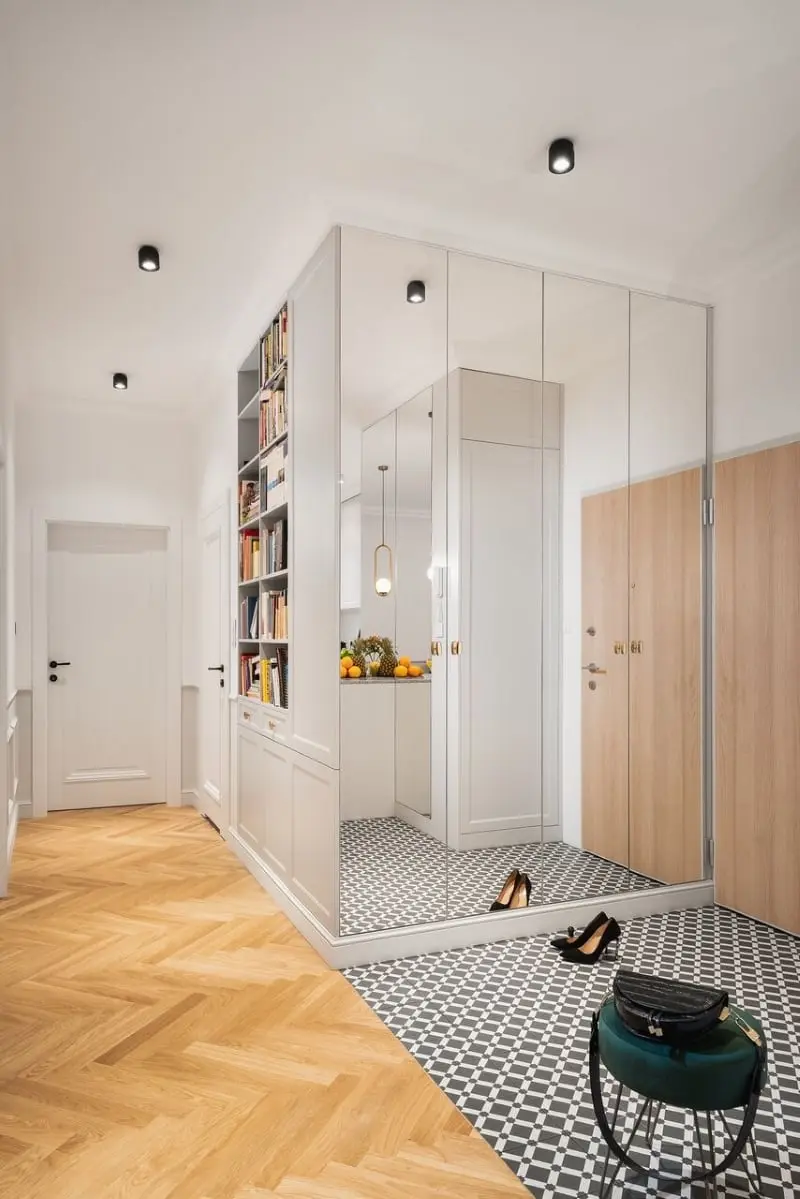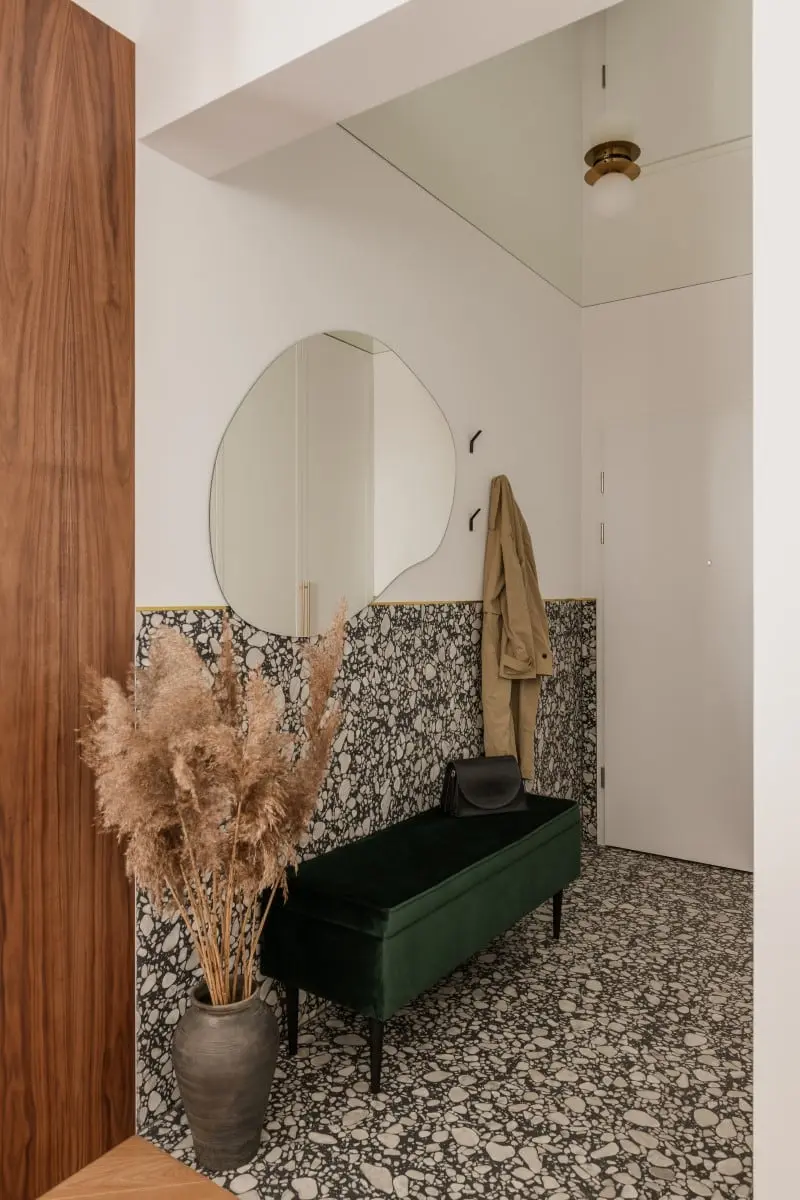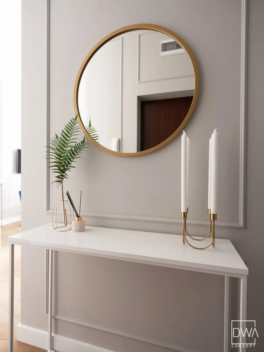 Lustro w aranżacji strefy wejścia, pełni dość oczywistą rolę – pozwala przejrzeć się tuż przed wyjściem z domu. Jednak poza tą praktyczną funkcją, lustro pomaga doświetlić przestrzeń, a także optycznie ją poszerza.