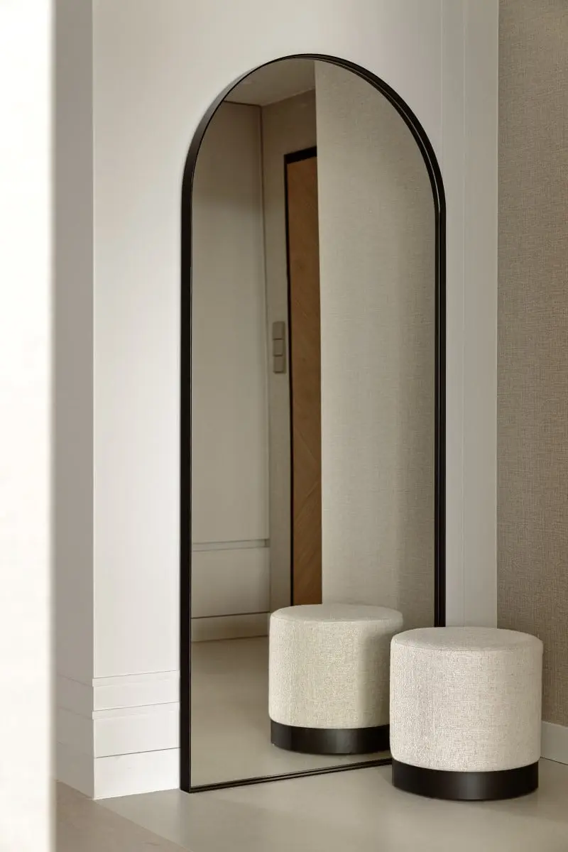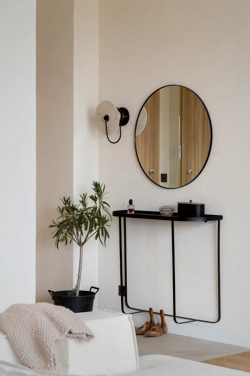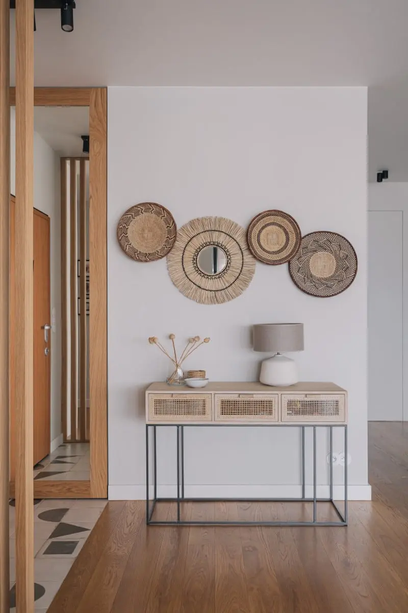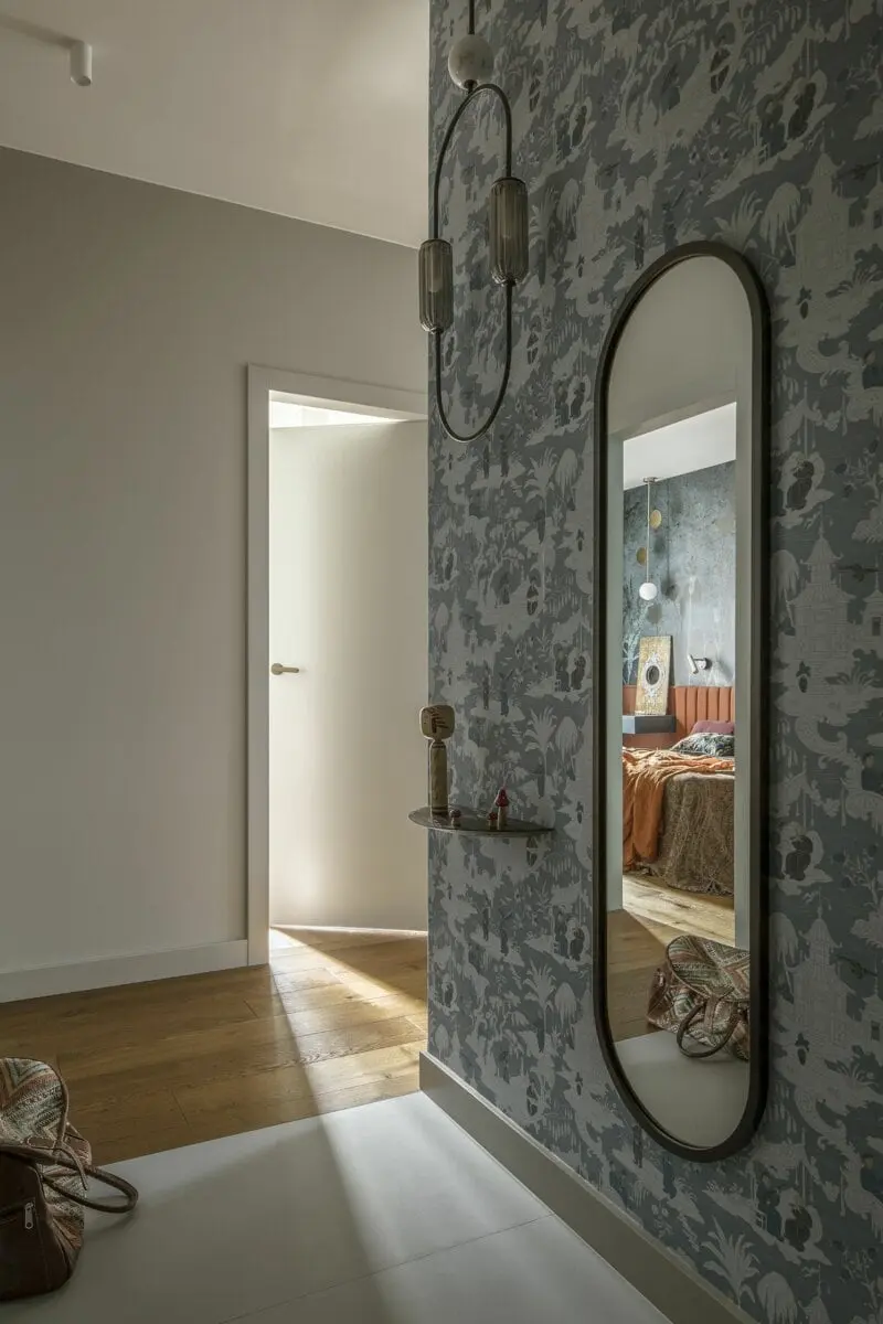 Lustro w aranżacji strefy wejścia, pełni dość oczywistą rolę – pozwala przejrzeć się tuż przed wyjściem z domu. Jednak poza tą praktyczną funkcją, lustro pomaga doświetlić przestrzeń, a także optycznie ją poszerza.
