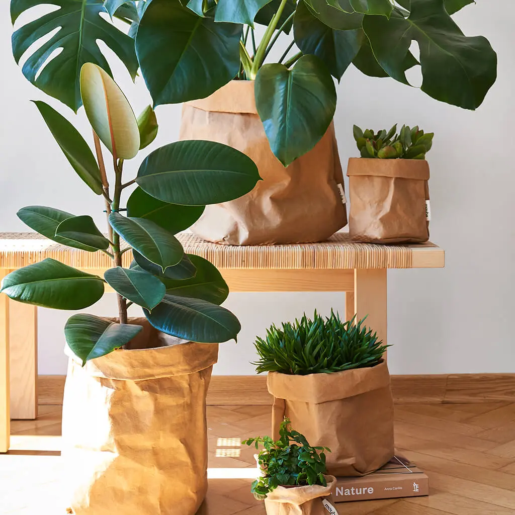 Worki marki Moyha idealnie komponują się z zielonymi roślinami, tworząc tym samym dekorację wnętrza. Jednak poza funkcją osłonki na doniczkę, można je wykorzystać do przechowywania drobiazgów, odzieży, a największe rozmiary posłużą jako kosz na pranie. Worki uszyte są z niezwykle wytrzymałej impregnowanej celulozy. Dzięki podobnemu procesowi produkcji do technik garbowania, materiał gwarantuje elastyczność i wytrzymałość, a w dotyku i wyglądzie przypomina skórę. Można czyścić na mokro, a nawet prać w pralce!