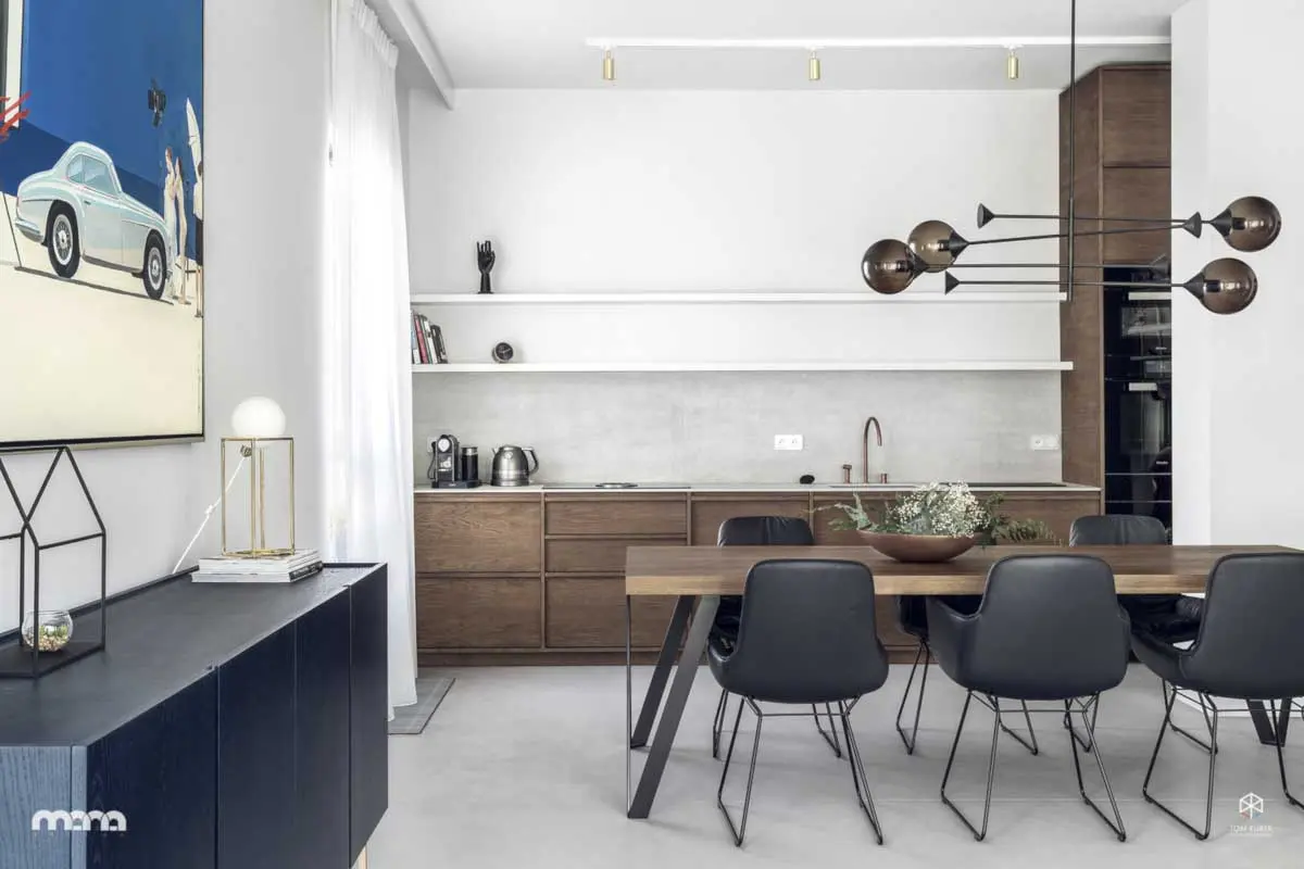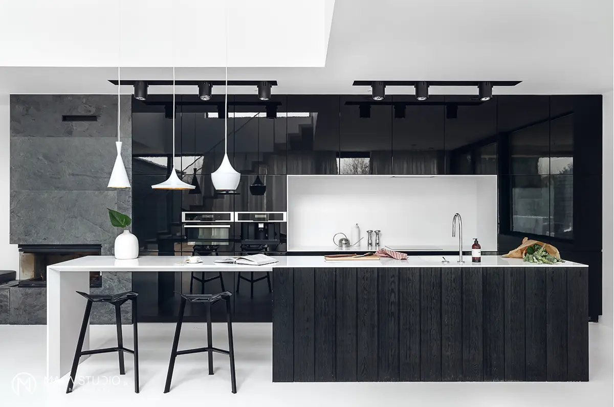 Złote projektory zamocowane na szynoprzewodzie oświetlają strefę kuchenną w projekcie Mana Design