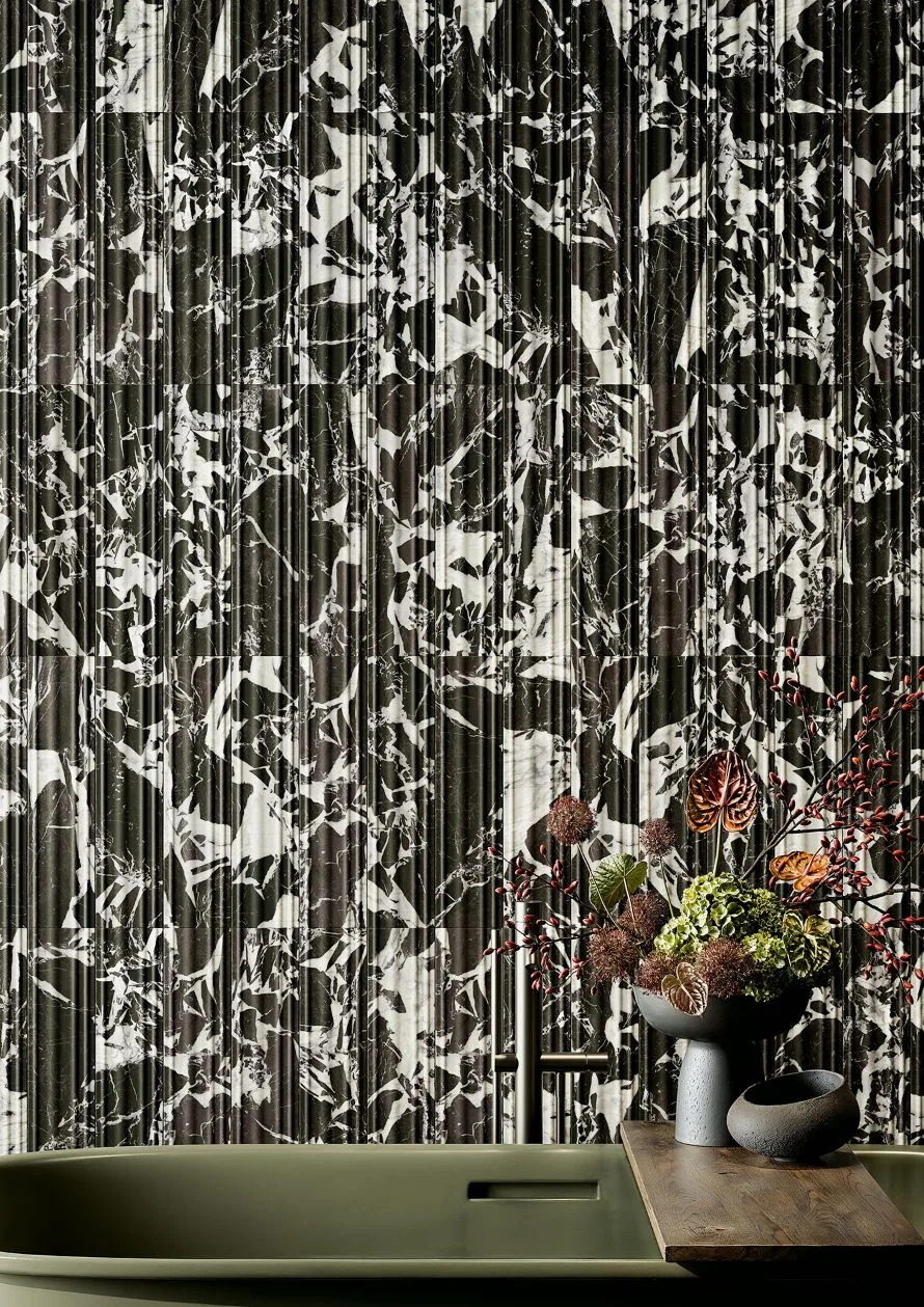 Struktura trójwymiarowa o falistym charakterze, która przepuszcza światło i nadaje powierzchni dynamiczny, a zarazem miękki wygląd. Efekt idealny do miejsc, gdzie ważna jest gra światła i cienia – np. w łazienkach czy przestrzeniach wellness. -