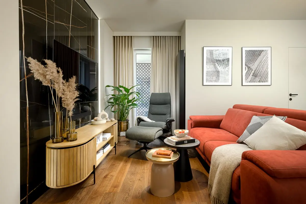 Ciepłe barwy na stałe wpisały się we współczesne aranżacje wnętrz. Ich popularność zaczęła się od kolorów ziemi, następnie zachwyciła nas terakota, której licznie odcienie oscylują między pomarańczem, ceglaną czerwienią, brązem, a nawet różem. Przypieczętowaniem tych trendów, zdaje się być wprowadzanie ciepłych tonacji do wnętrz, pod postacią tapicerek meblowych, które do tej pory były dość zachowawcze. W te tendencje wpisuje się ruda sofa, będąca coraz częściej punktem fokusowym salonów i części dziennych. Architekci traktują ją jako uzupełnienie projektów o bardzo różnym stylu – od eklektyczny, przez boho po nawet minimalistyczne. Przyjrzyjmy się najciekawszym propozycjom architektów na salon z rudą sofą.