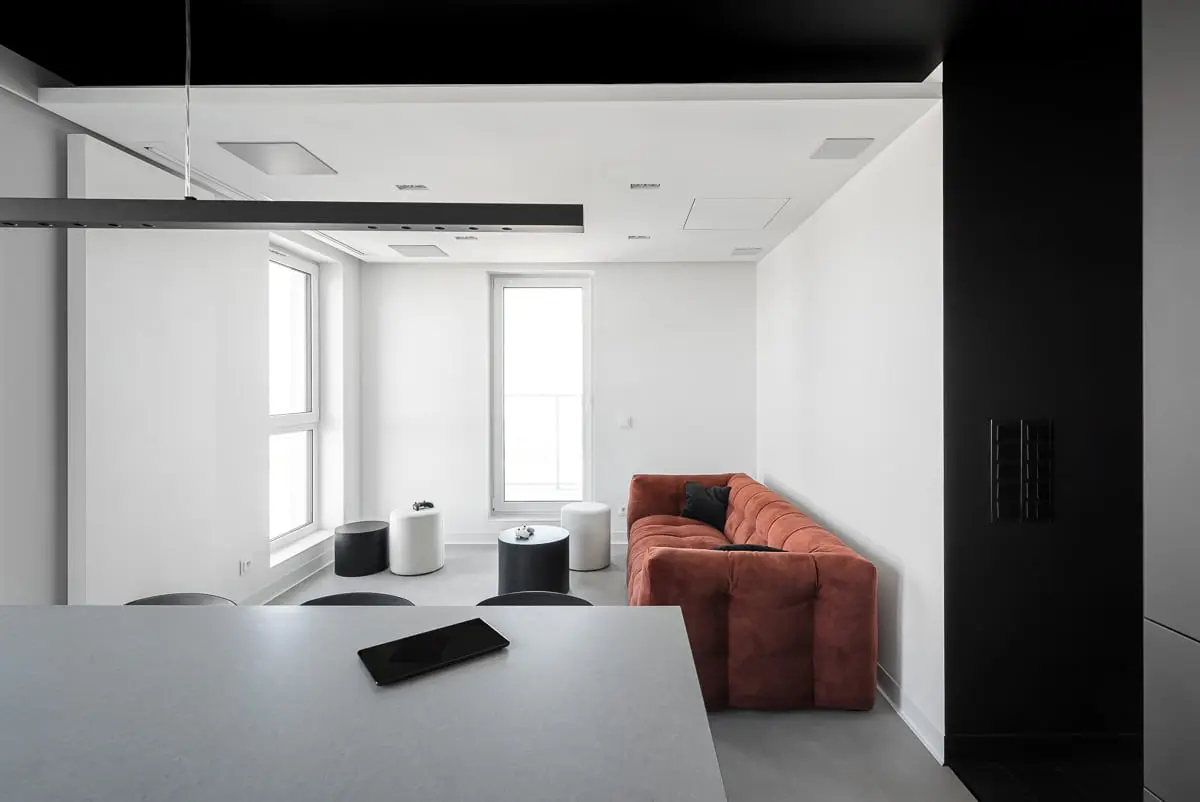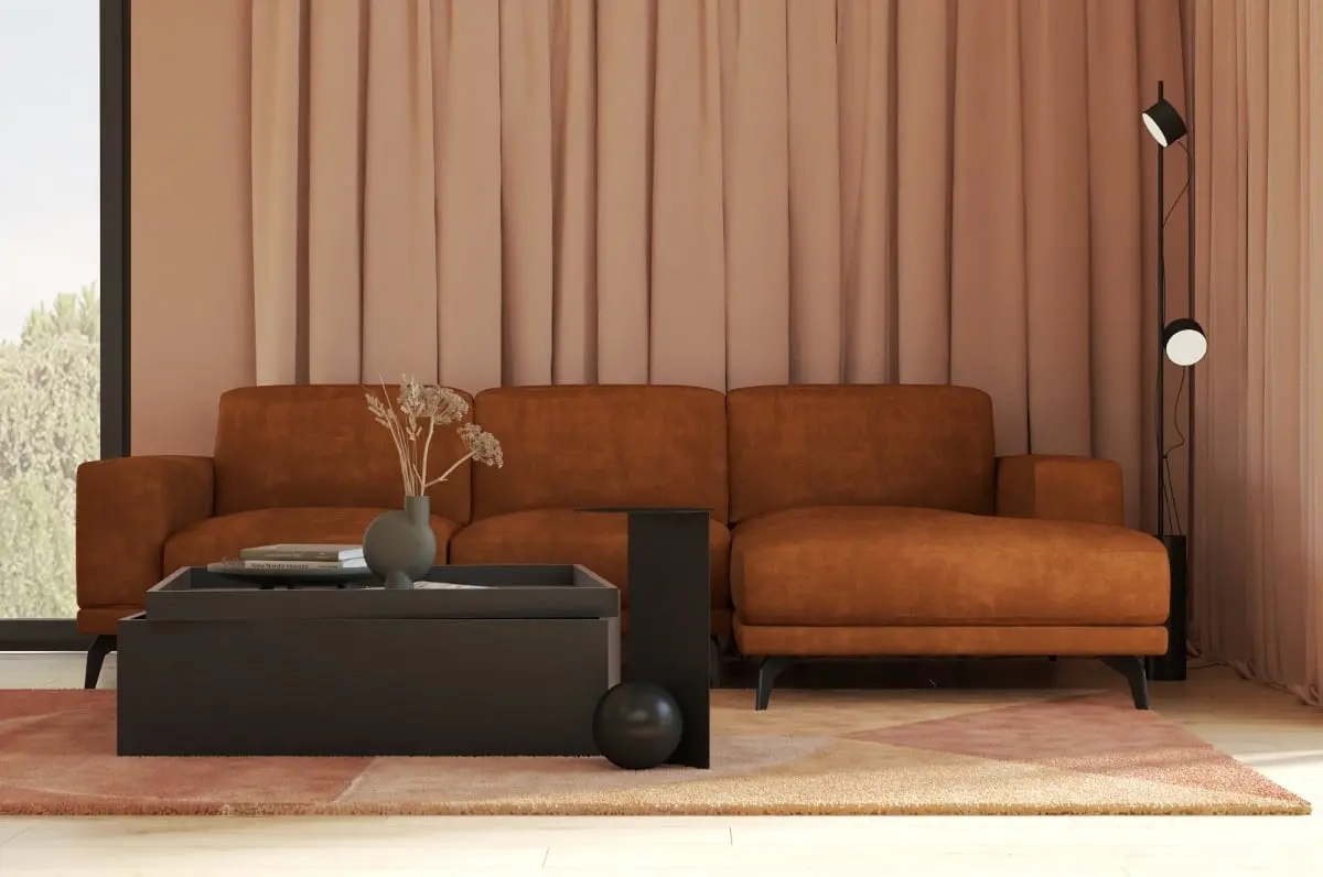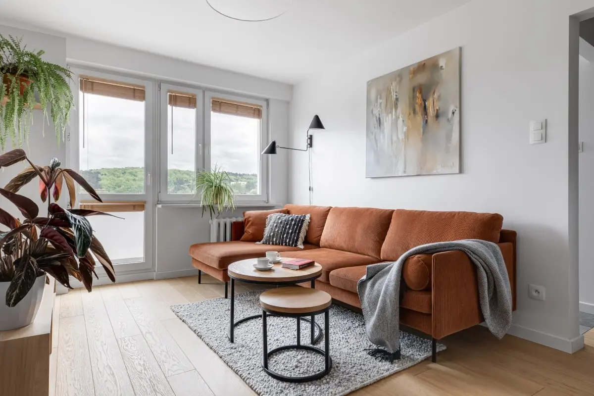 Minimalistyczne projekty, w których dominuje ograniczona paleta barw – najczęściej biel, czerń i szarość, zyskuje pożądany faktor przytulności kiedy pojawi się w nich ruda sofa. Mebel wypoczynkowy w tej tapicerce, szybko odmieni wnętrza w stylu scandi, których popularność jest dawno za nami.