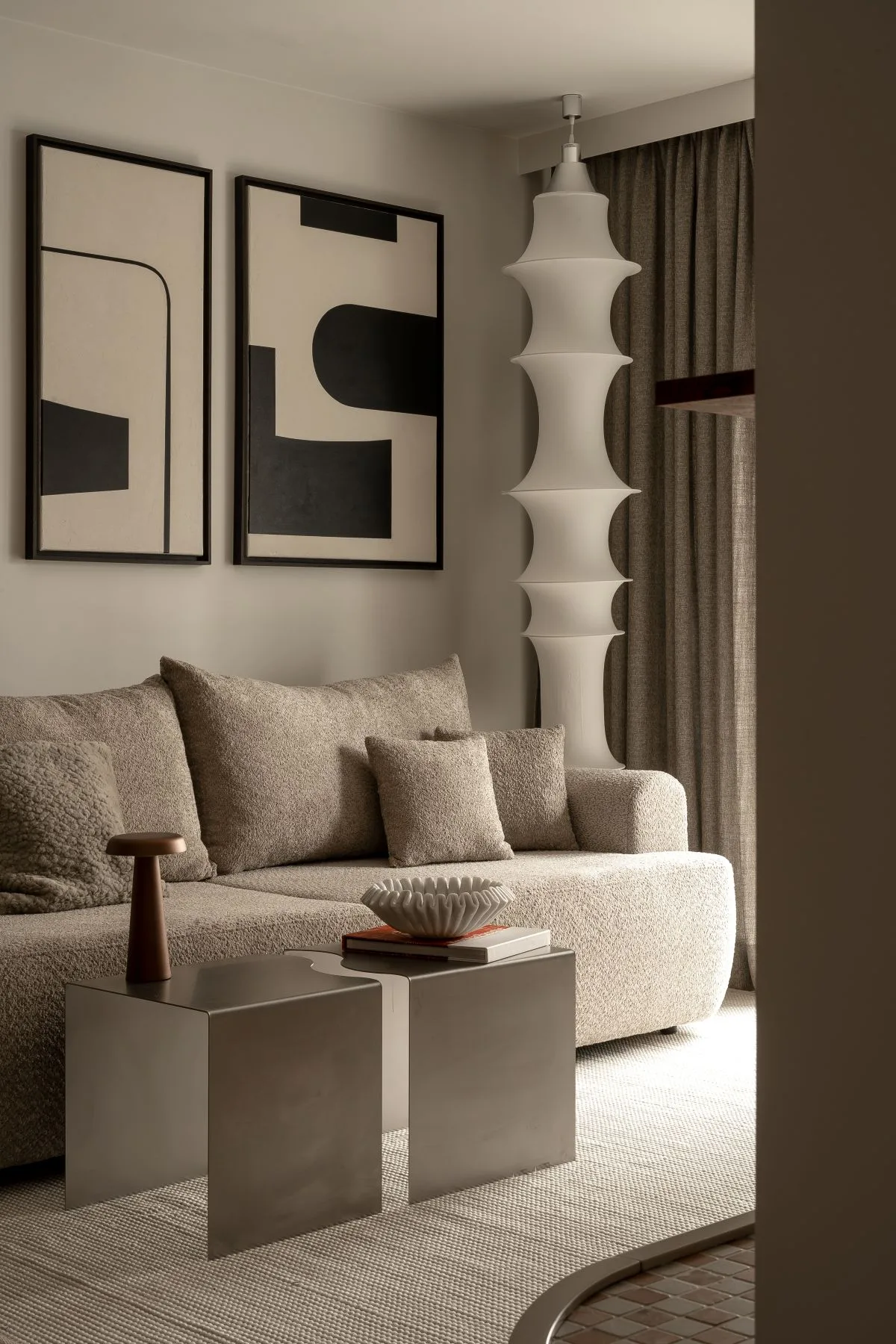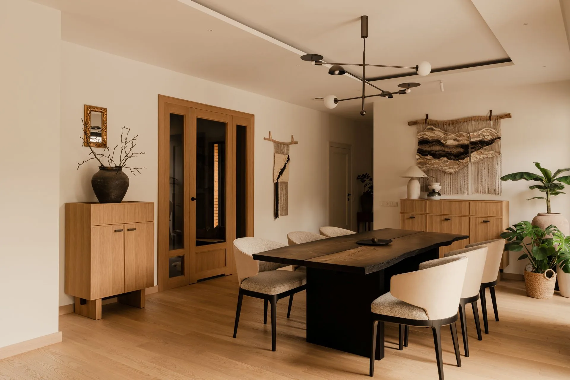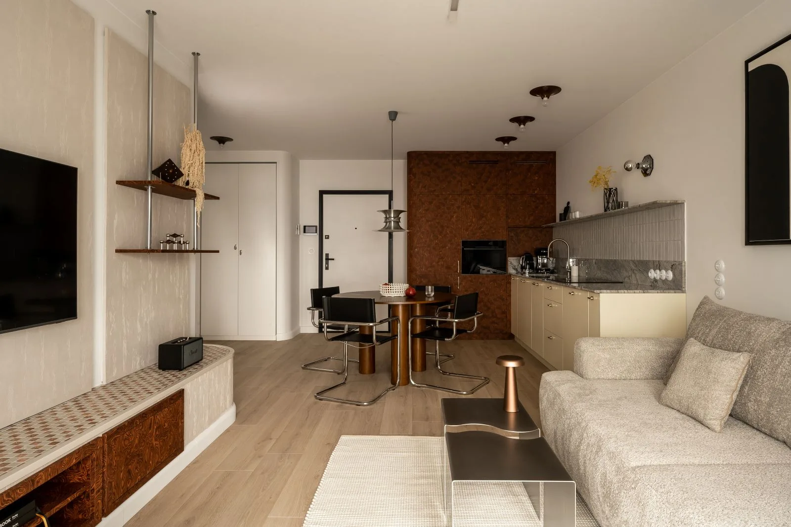 Szlachetne materiały podkreślają dążenie do jakości, a organiczne formy mebli i oświetlenia wprowadzają subtelną dynamikę. Funkcjonalność przeplata się tu z dekoracyjnością: modułowe rozwiązania, warstwowe oświetlenie czy wielkoformatowe płytki ścienne nie tylko zdobią, lecz także odpowiadają na realne potrzeby użytkowników. W efekcie salon staje się miejscem harmonii, sensorycznego komfortu i świadomego designu.