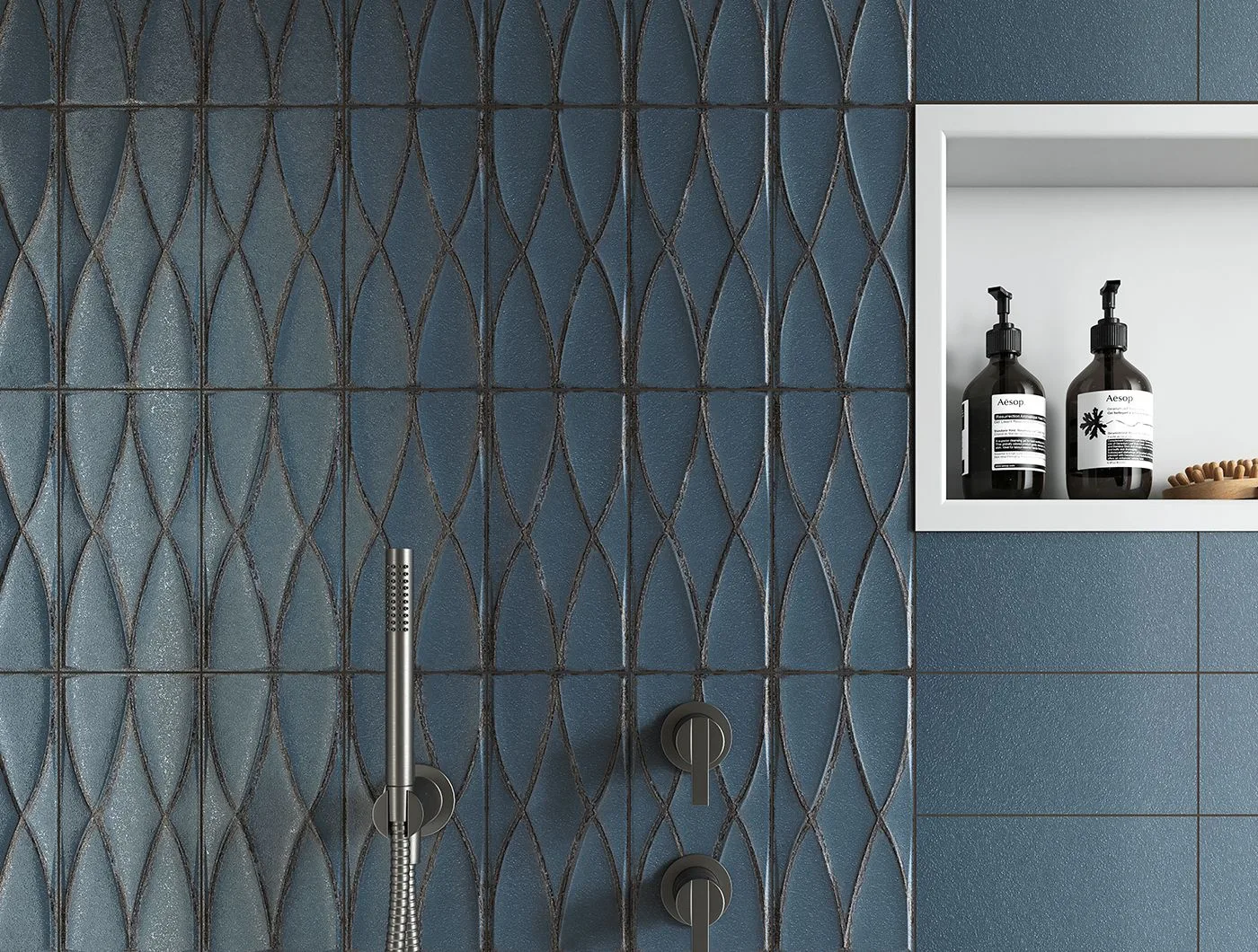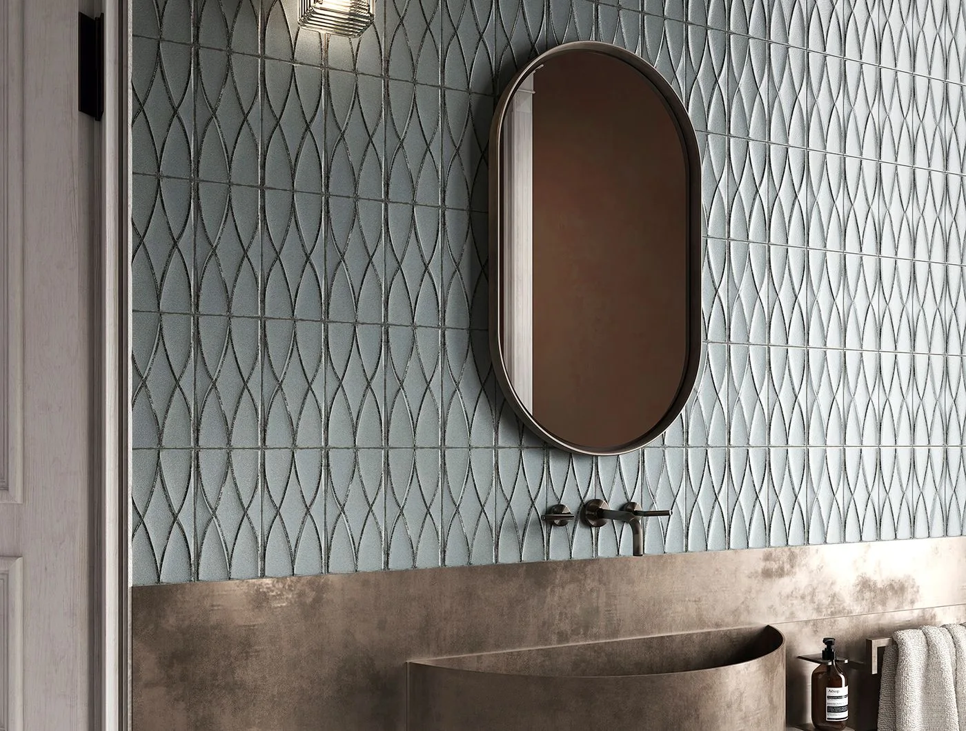 Powierzchnia płytek łapie światło niczym spokojna tafla wody, tworząc subtelne refleksy, które wprowadzają do wnętrza niepowtarzalną aurę spokoju i światła.