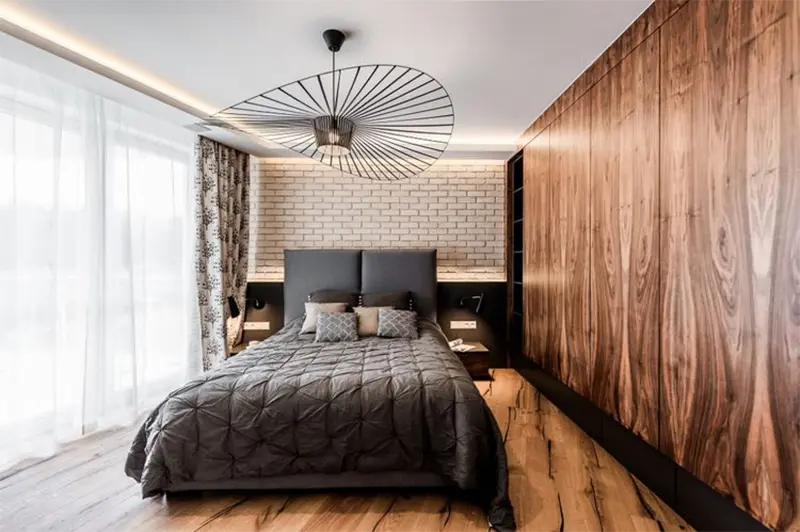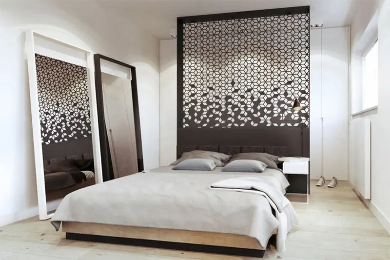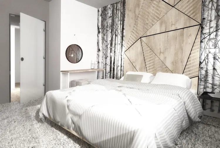 Jeśli podoba Wam się idea geometrycznych wzorów, jednak nie jesteście zwolennikami konkretnych barw w sypialni proponujemy wykonać podobny kolaż z drewnianych płyt. Możecie połączyć je z tapetą/fototapetą przedstawiającą czarno-białe wyobrażenie lasu widzianego poprzez konary drzew. Pamiętajcie jednak, że w takim przypadku dobrze jest przywrócić balans między kanciastymi i miękkimi formami poprzez wprowadzenie do sypialni na przykład puszystego dywanu.