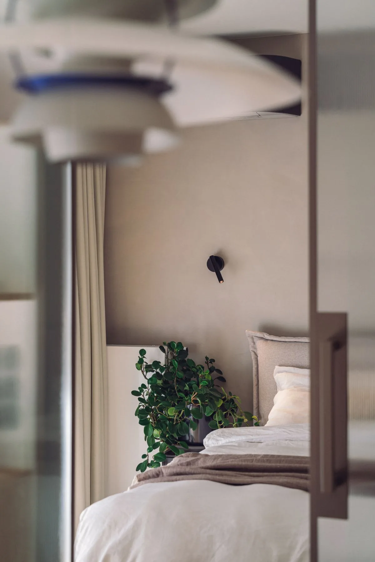 Niczym złoty promień zachodzącego słońca, ciepłe metaliczne akcenty w mosiądzu, złocie i miedzi rozświetlają sypialniane wnętrze. Lampa o delikatnym łuku rzuca migotliwy cień, uchwyt komody przyciąga wzrok swym blaskiem. To nie ekstrawagancja — to subtelny błysk harmonii, który czyni przestrzeń bardziej osobistą, intymną i pełną oddechu.