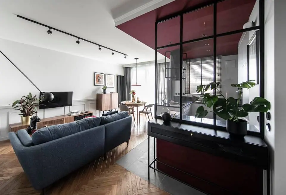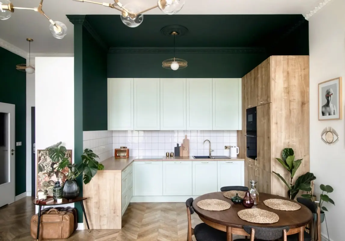 Pokryty kolorem sufit jest nieoczekiwanym akcentem dekoracyjnym, który automatycznie staje się punktem fokusowym