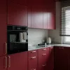 Jak zaznacza architektka Karolina Szyszka, zastosowanie spieku kwarcowego było podyktowane nie tylko jego niezniszczalnością i wytrzymałością. Subtelny wygląd wzoru Taj Mahal nadaje spokojny ton odważnej kuchni w jednolitym kolorze. Bordo pojawia się na frontach wszystkich szafek oraz suficie, gdzie został wyróżniony formą łuku. Ten efektowny zabieg ,,domyka” całą aranżację oraz pozwolił na optyczne wydzielenie aneksu kuchennego z jadalnią w otwartej strefie dziennej.